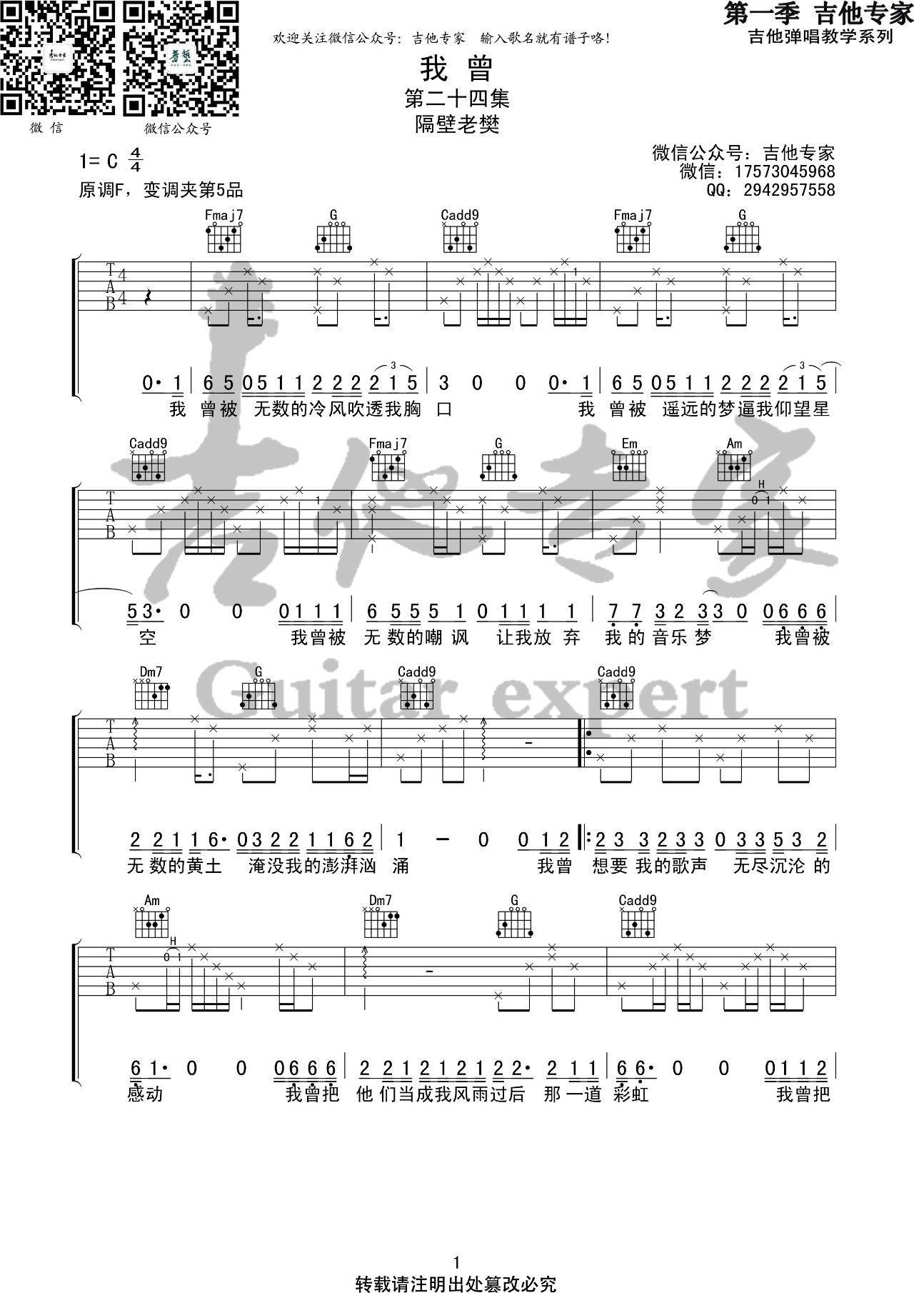 曲谱介绍: 隔壁老樊《我曾》吉他弹唱谱,采用C调指法编配,音艺吉他编配出品,共有3张高清图谱。