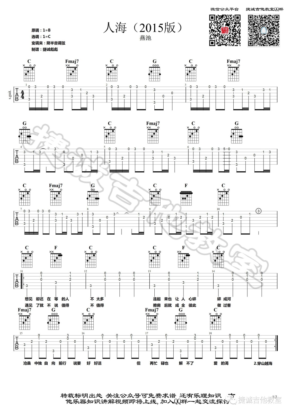 曲谱介绍: 燕池《人海》吉他弹唱谱,采用C调指法编配,捷诚吉他教室编配出品,共有3张高清图谱。