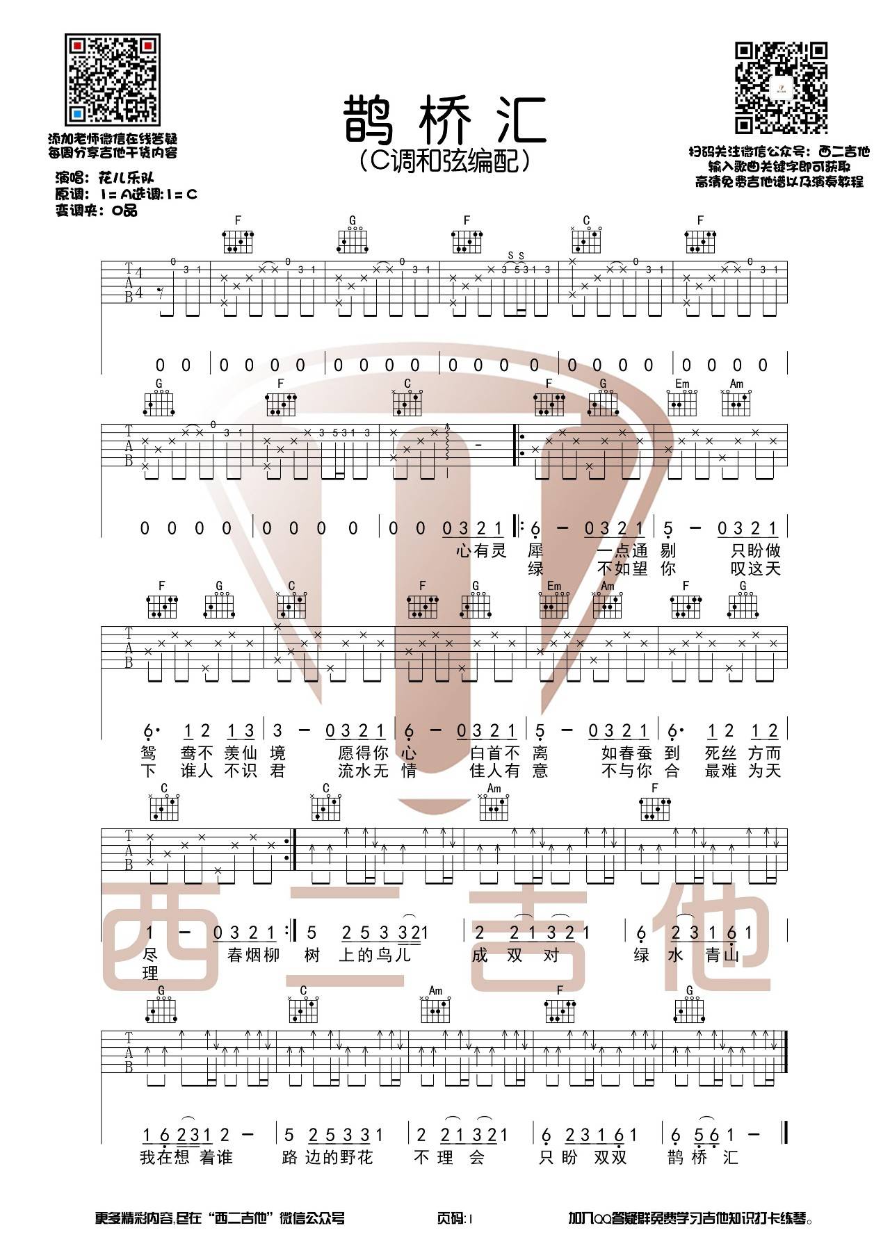 曲谱介绍: 花儿乐队《鹊桥汇》吉他弹唱谱,采用C调指法编配,西二吉他编配出品,共有1张高清图谱,免翻页排版设计。