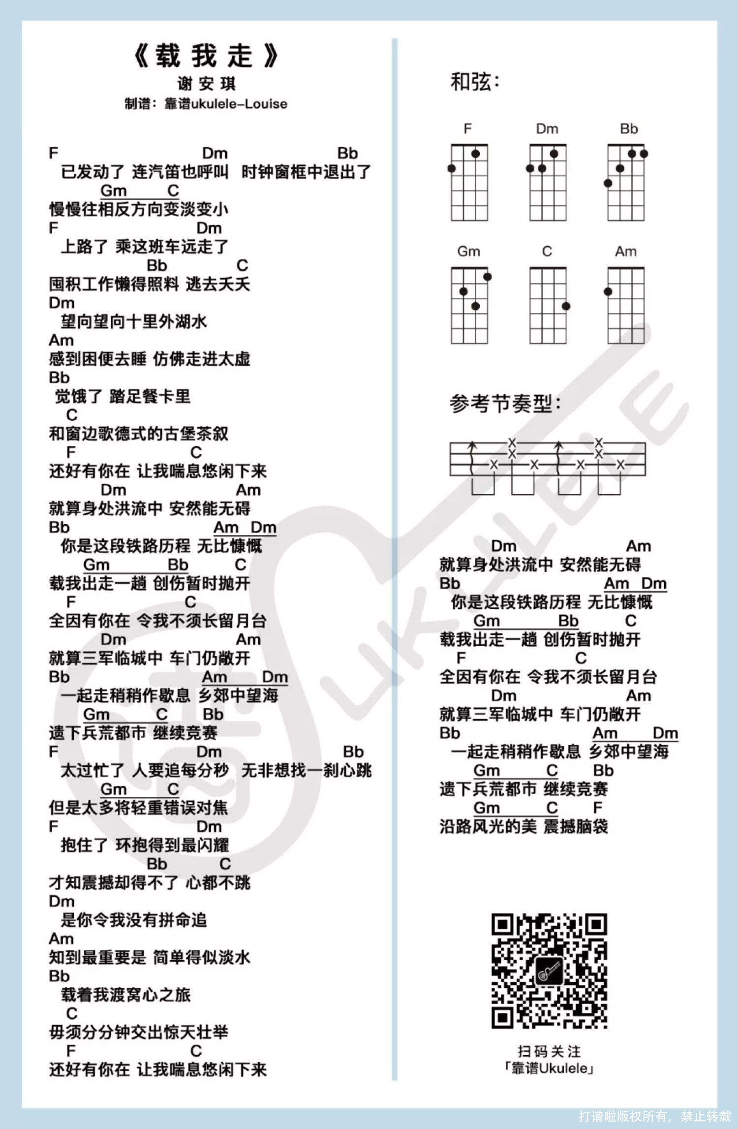 曲谱介绍: 这是一位「巨额」打赏的朋友求谱曲之一。粤语是真的不擅长的一个部分,学唱很费劲对我哈哈哈哈哈,唱是唱不下来完整的,坑坑巴巴的一句一段还是勉强打好了这首歌的谱,有觉得哪里不合适的小伙伴欢迎在最下方留言来聊聊哟~ 这首不是原调哟~这点必须强调一下,和弦总体来说都不难,是我分享的谱中常见和弦。只要你熟悉这首歌基本上手还是不太难的。 难度系数:★☆   载我走 尤克里里谱: