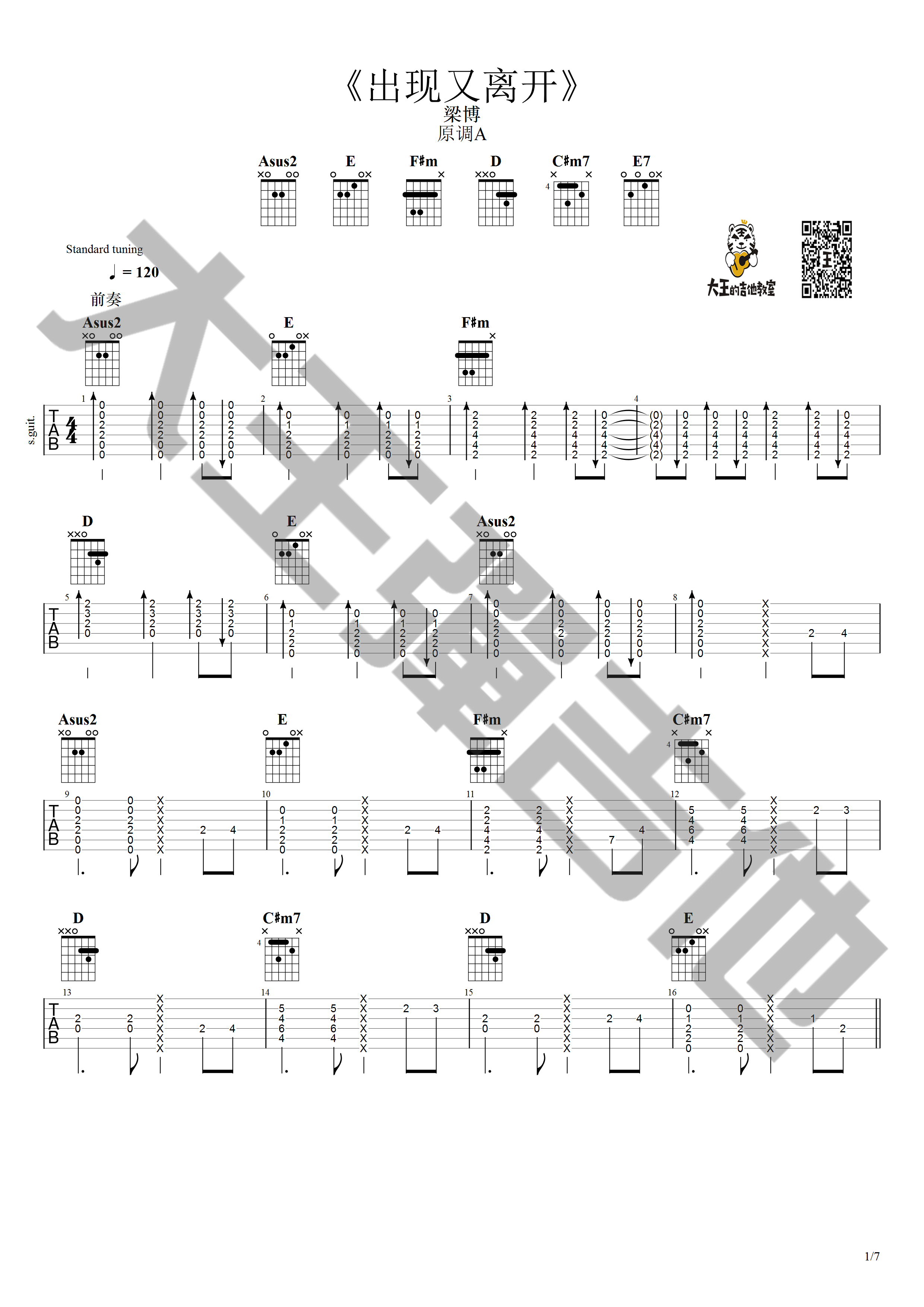 曲谱介绍: 梁博《出现又离开》吉他弹唱谱,采用A调指法编配,大王弹吉他编配出品,共有7张高清图谱。