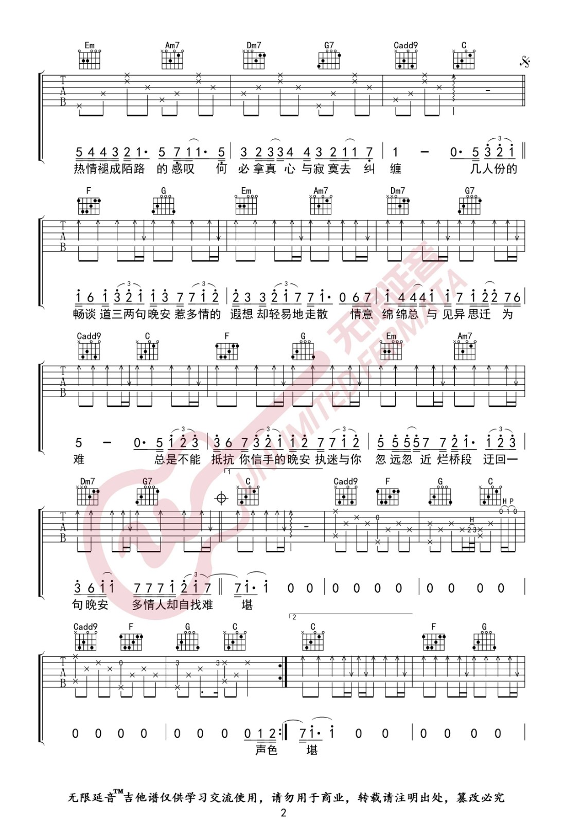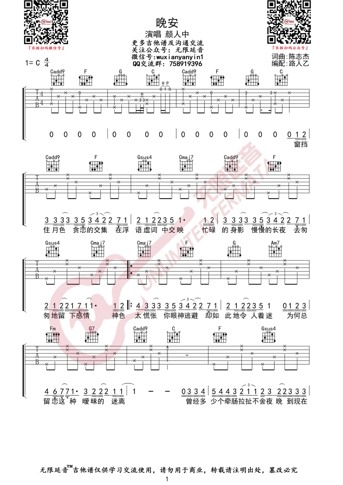 曲谱介绍: 颜人中《晚安》吉他弹唱谱,采用C调指法编配,无限延音编配出品,共有3张高清图谱。