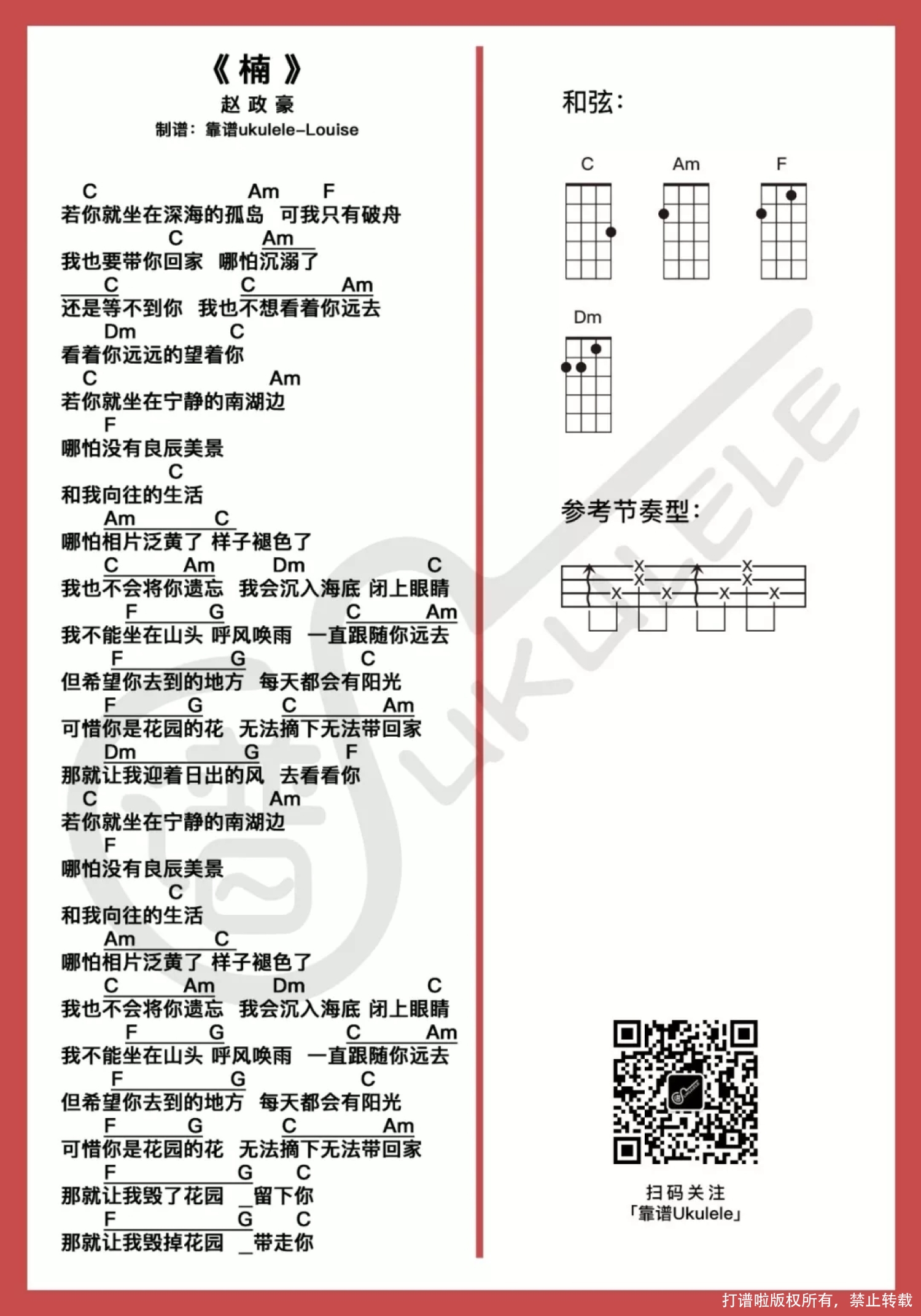 曲谱介绍: 赵政豪,《创造营2019》选手。这首歌是求谱来的,至于这个节目还有这个小朋友个人不是很了解,有人来说说吗? 这里就直接给谱了(Louise偷懒的一次分享哈哈哈哈哈)。 难度系数:★ 原调太低了哈哈哈,这个版本非原调。当然还有一个原因,这个版本和弦简单易上手(无敌和弦组,最喜欢用这样的和弦了哈哈哈哈哈)。 节奏型的部分,单单是使用基础下扫也是ok的。