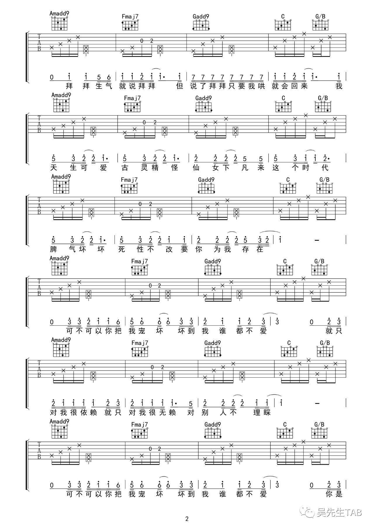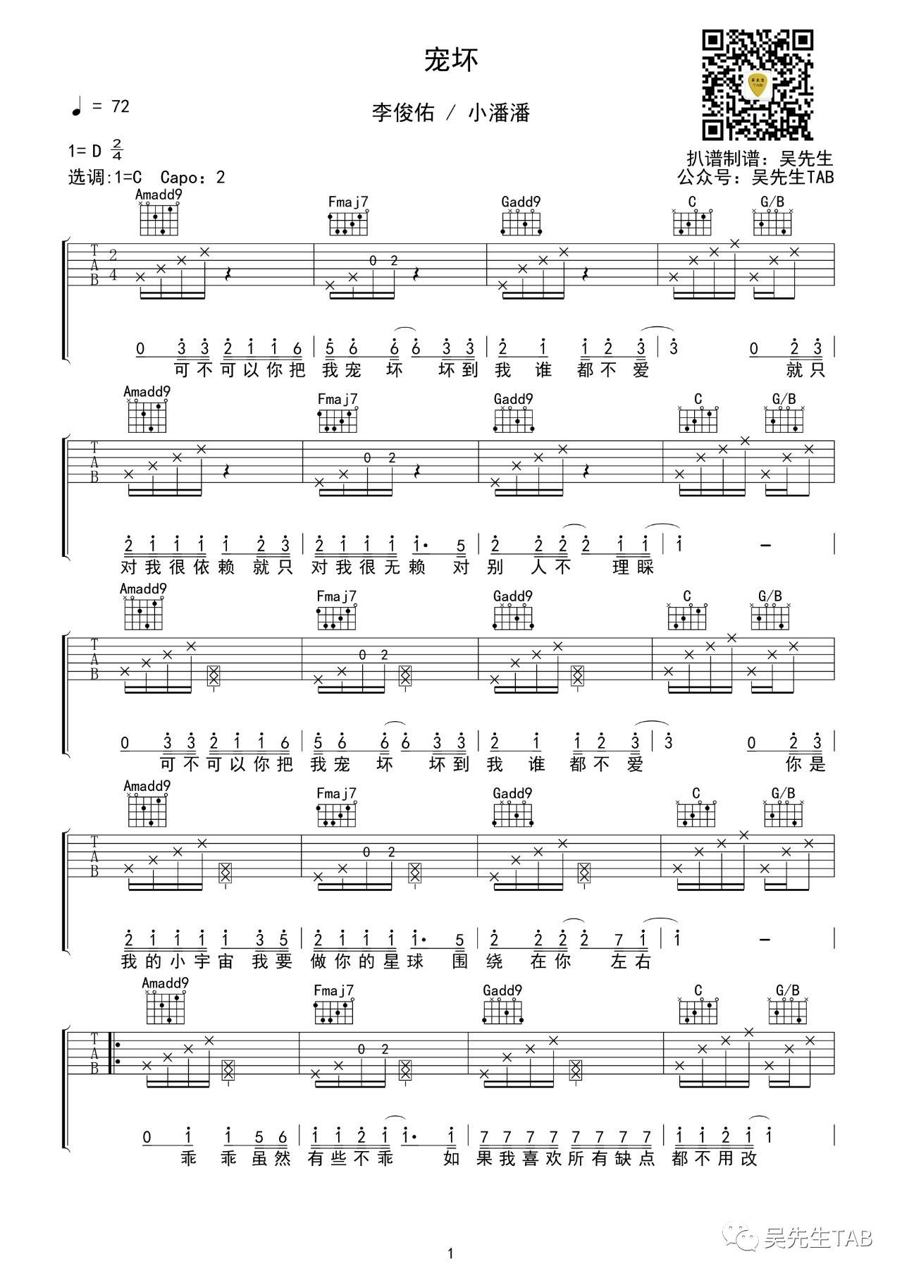 曲谱介绍: 李俊佑《宠坏》吉他弹唱谱,采用C调指法编配,吴先生编配出品,共有4张高清图谱。