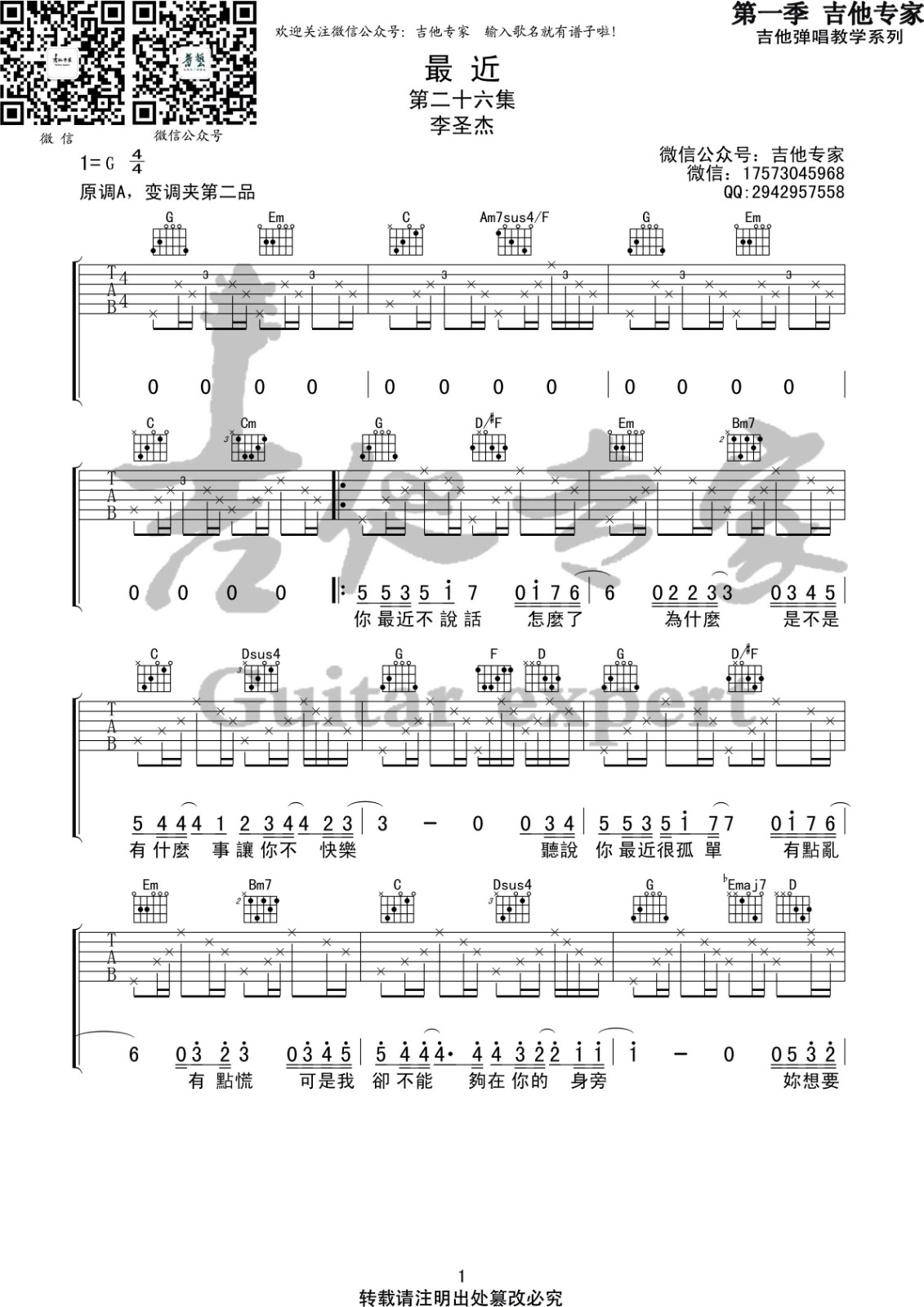 曲谱介绍: 李圣杰《最近》吉他弹唱谱,采用G调指法编配,音艺吉他编配出品,共有3张高清图谱。
