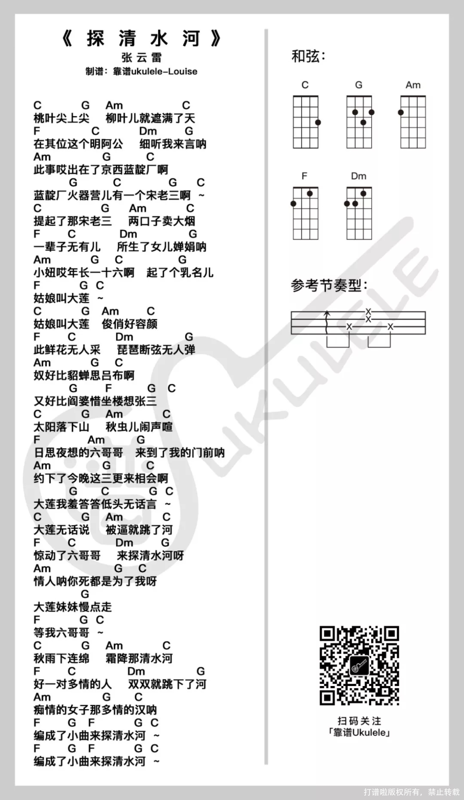 曲谱介绍: 有喜欢张云雷的小伙伴求谱要了这首歌。身边有那么几个朋友很喜欢听德云社的相声,Louise也挺喜欢挺相声的,只是跟他们比起来显得没有那么常听。所以当有人跟我要这首歌的谱子的时候,我愣了一下,从来没有想过用尤克里里分享一首北京小曲儿,这感觉还蛮特别的(当然张云雷的版本有用到吉他,尤克里里感觉也应该不差吧嘿嘿)。 难度系数:★ 非原调,这里就根据我自己的情况,选择和弦较易上手的调给到各位啦。 歌词的版本是根据上面音频的版本来的,缺少的部分,就只能你们自己尝试去补充上(就当布置个「作业」可好?偷个懒的Louise飘走咯~)。