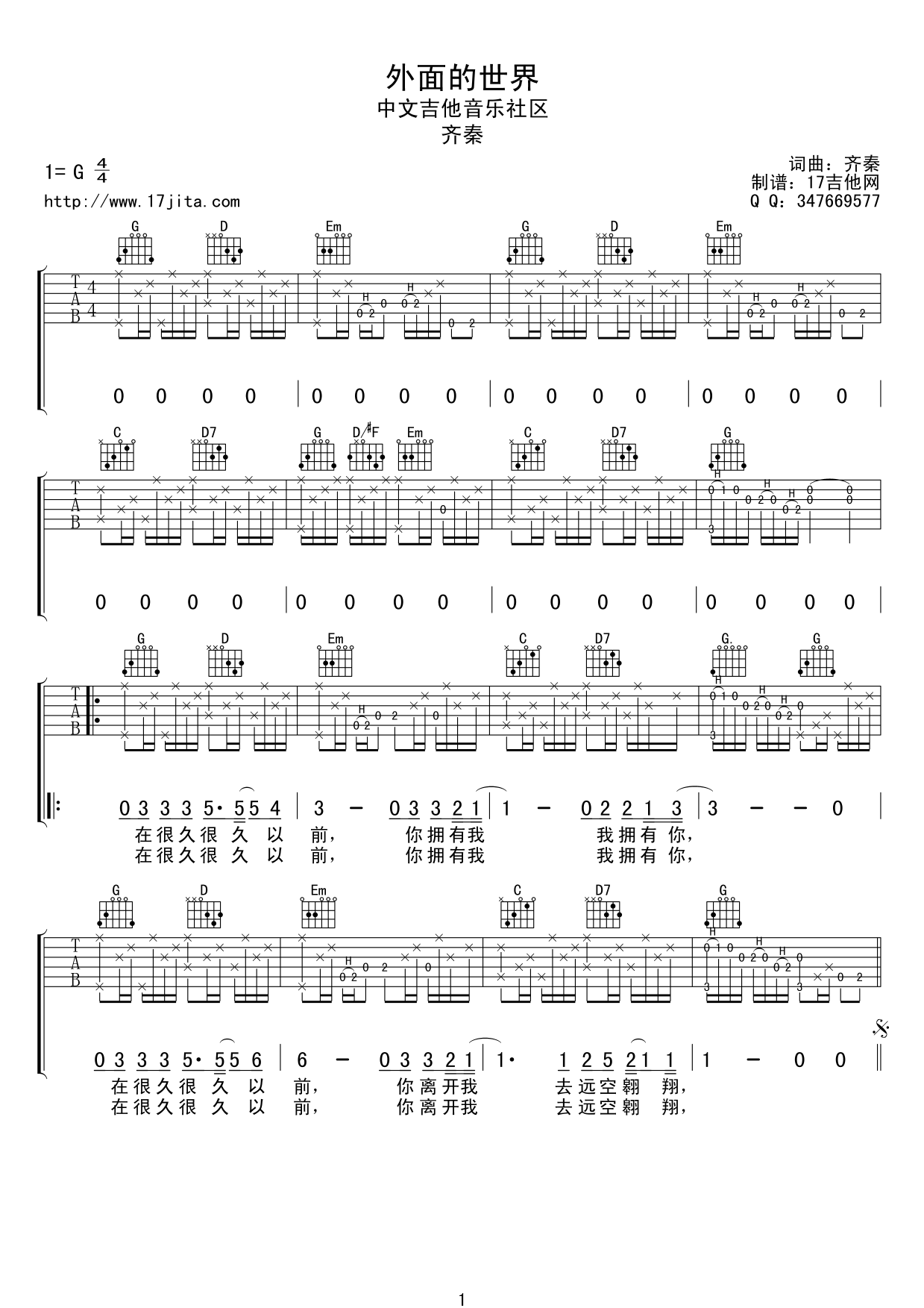 曲谱介绍: 齐秦《外面的世界》吉他弹唱谱,采用G调指法编配,17吉他编配出品,共有3张高清图谱。