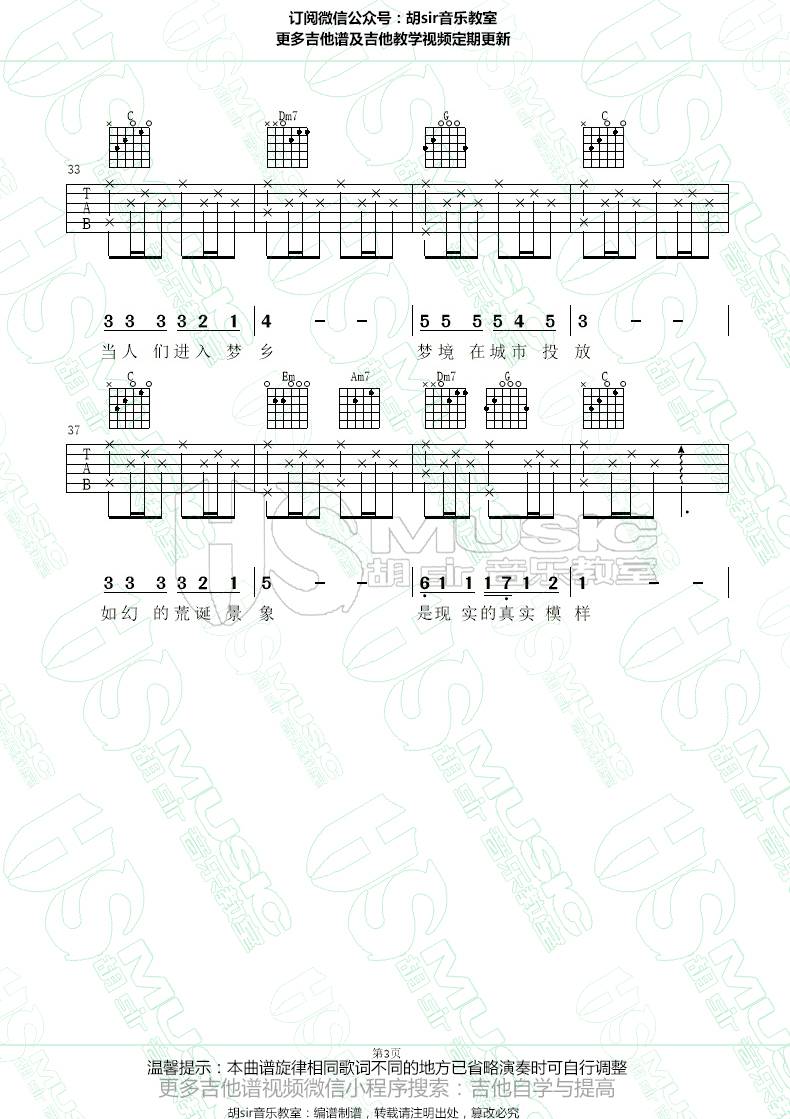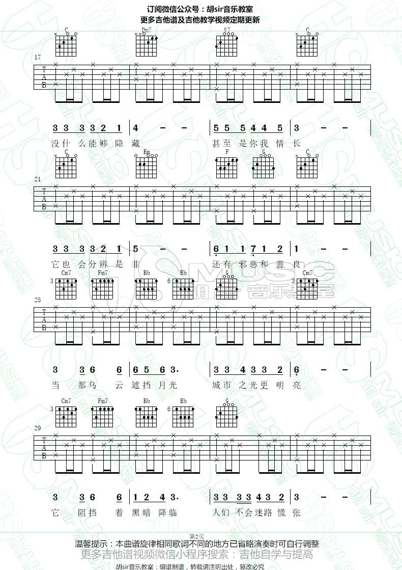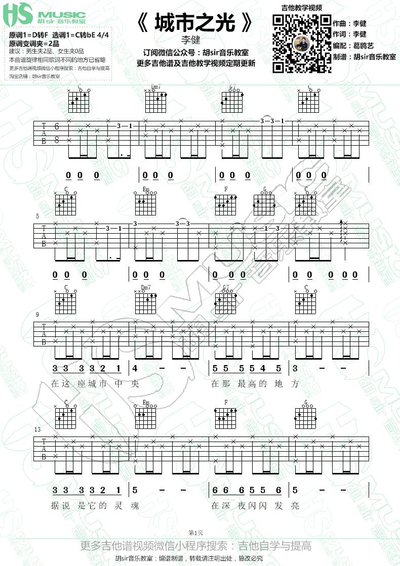 曲谱介绍: 李健《城市之光》吉他弹唱谱,采用C调指法编配,胡sir音乐教室编配出品,共有3张高清图谱。
