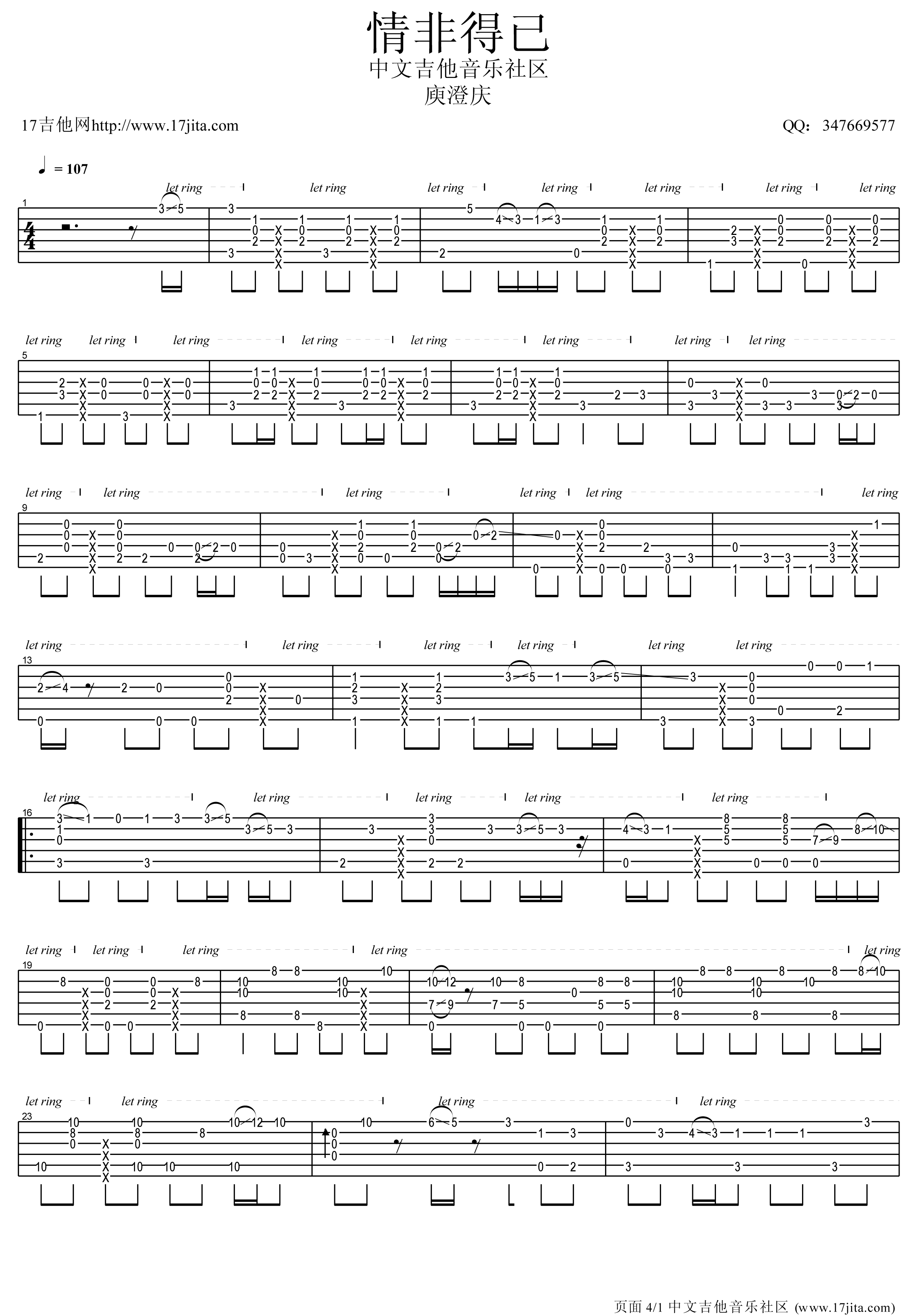 曲谱介绍: 庾澄庆《情非得已》吉他独奏谱,17吉他编配出品,共有4张高清图谱。
