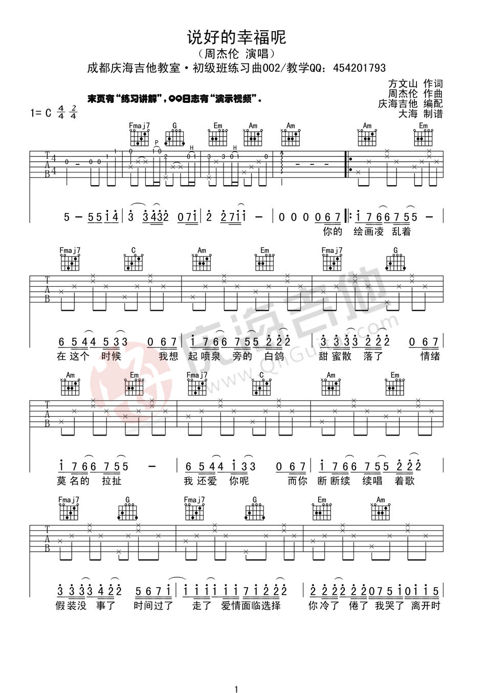 曲谱介绍: 周杰伦《说好的幸福呢》吉他弹唱谱,采用C调指法编配,庆海吉他教室编配出品,共有3张高清图谱。