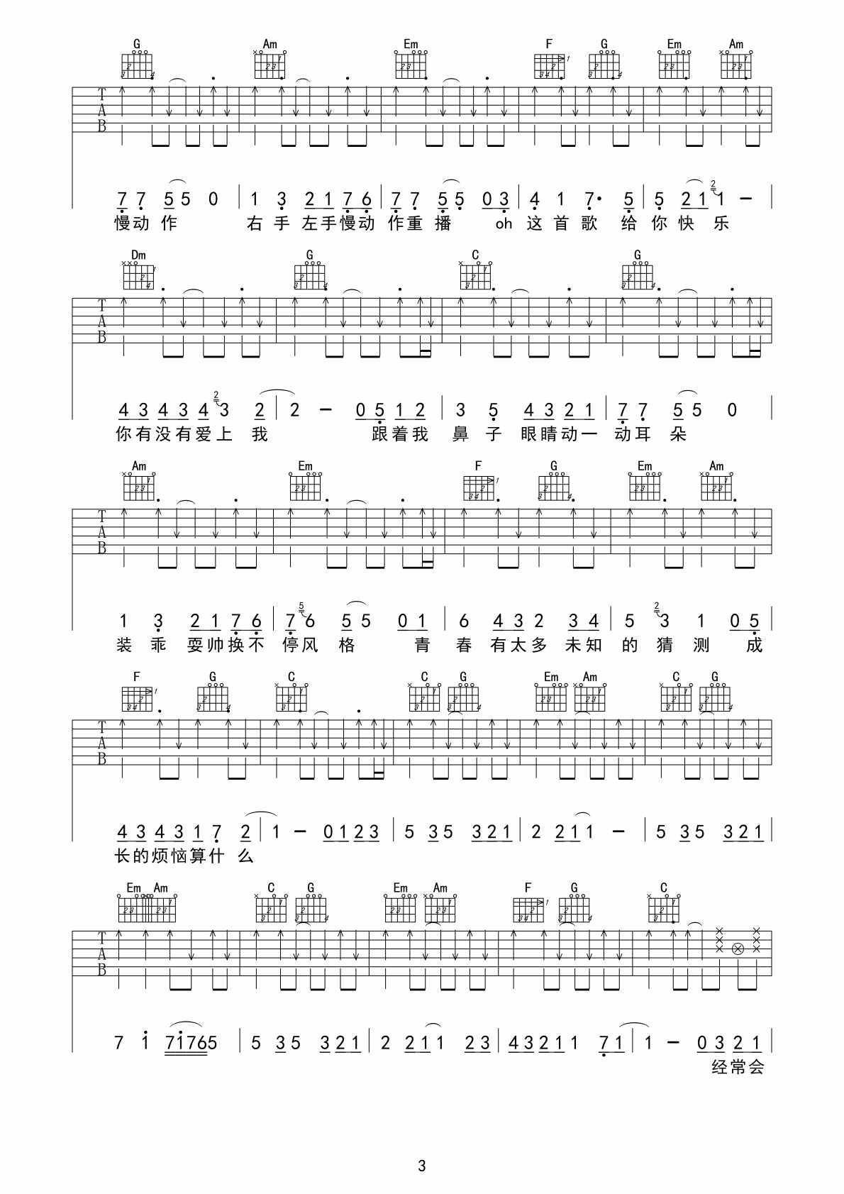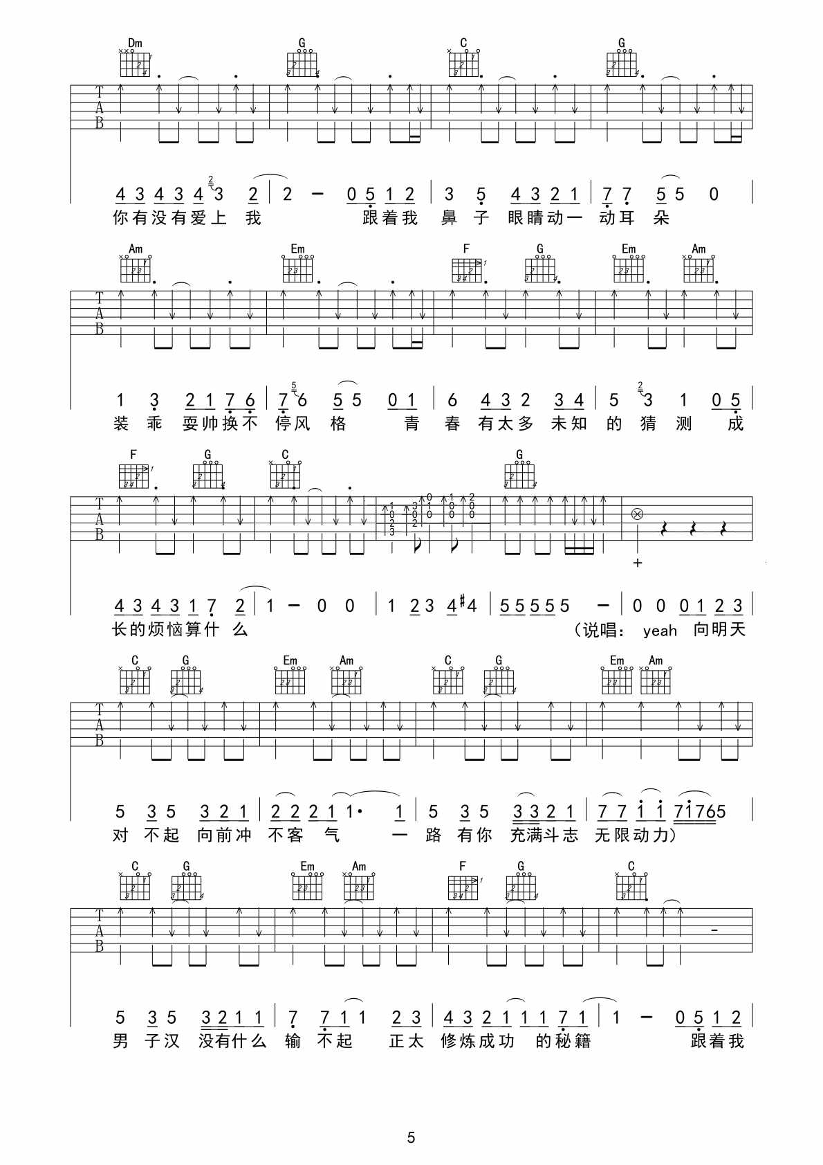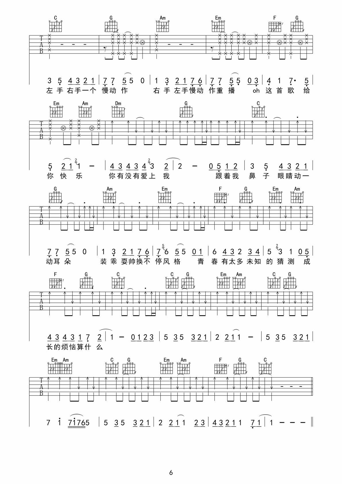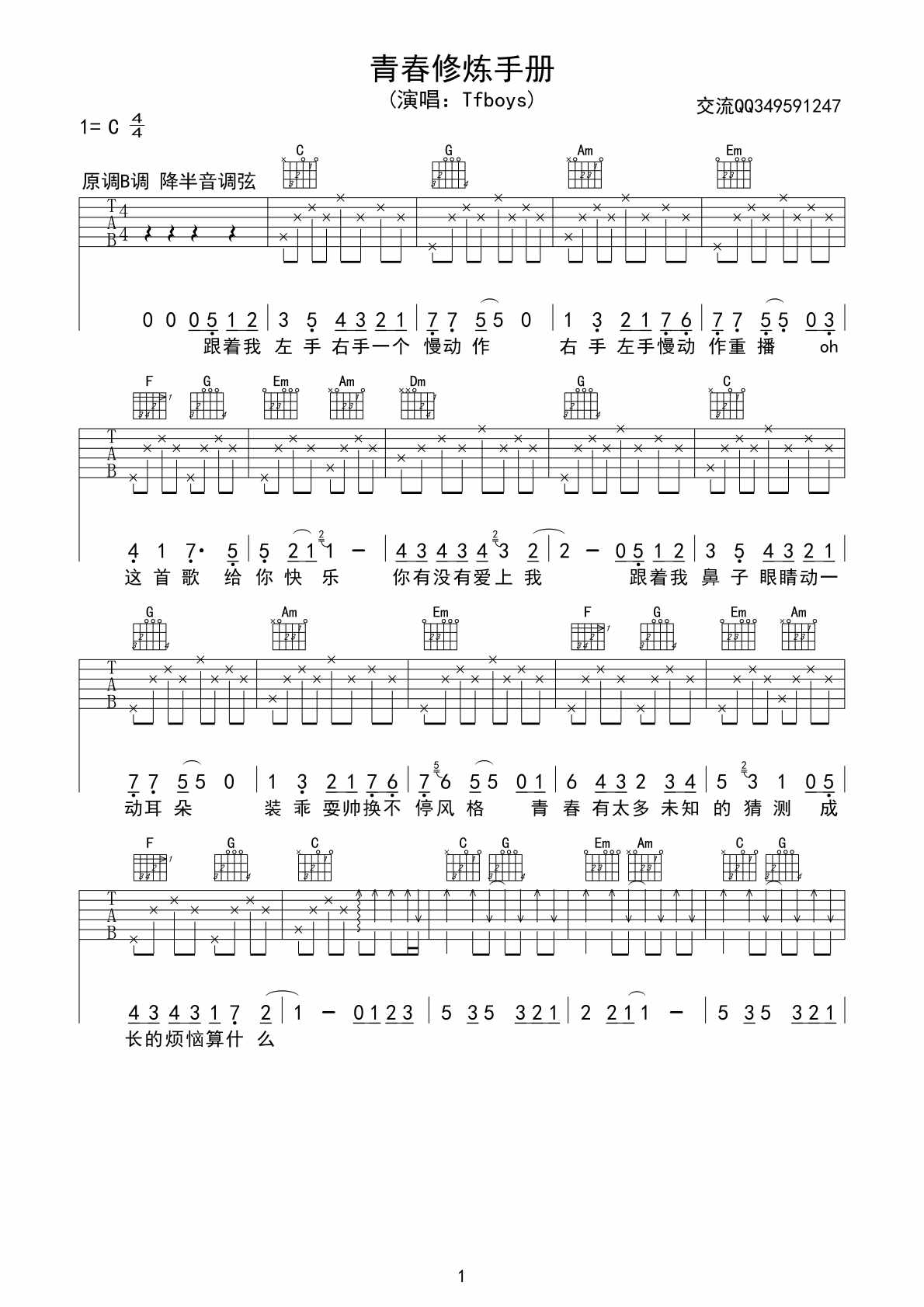 曲谱介绍: TFBOYS《青春修炼手册》吉他弹唱谱,采用C调指法编配,共有6张高清图谱。