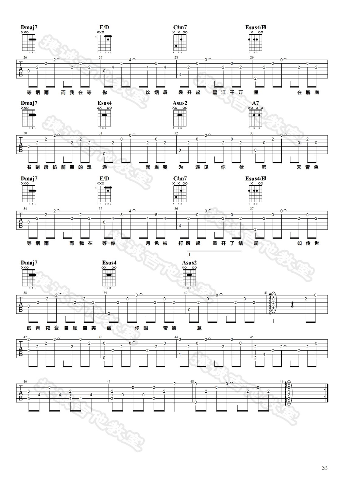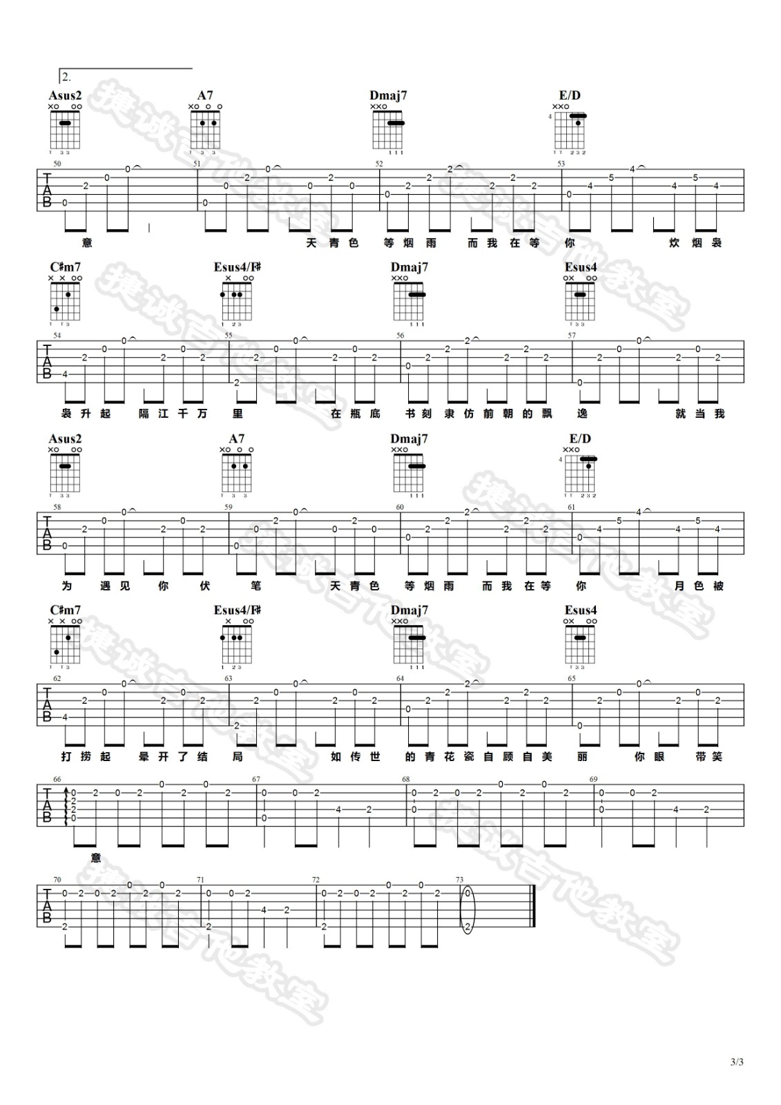 曲谱介绍: 周杰伦《青花瓷》吉他弹唱谱,采用A调指法编配,捷诚吉他教室编配出品,共有3张高清图谱。