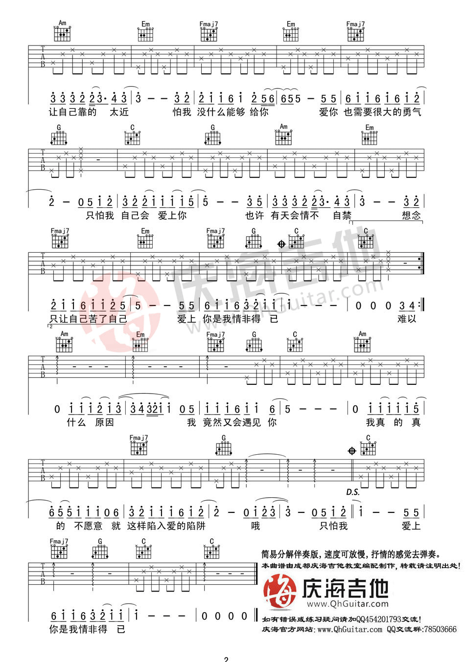 曲谱介绍: 庾澄庆《情非得已》吉他弹唱谱,采用C调指法编配,庆海吉他教室编配出品,共有2张高清图谱,免翻页排版设计。