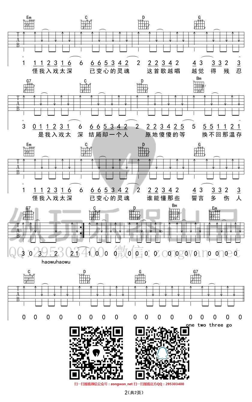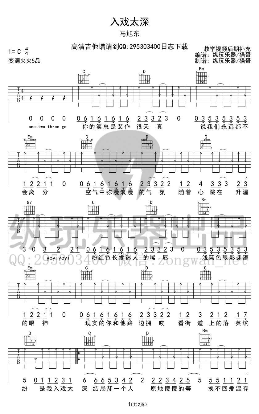 曲谱介绍: 马旭东《入戏太深》吉他弹唱谱,采用C调指法编配,纵玩乐器编配出品,共有2张高清图谱,免翻页排版设计。