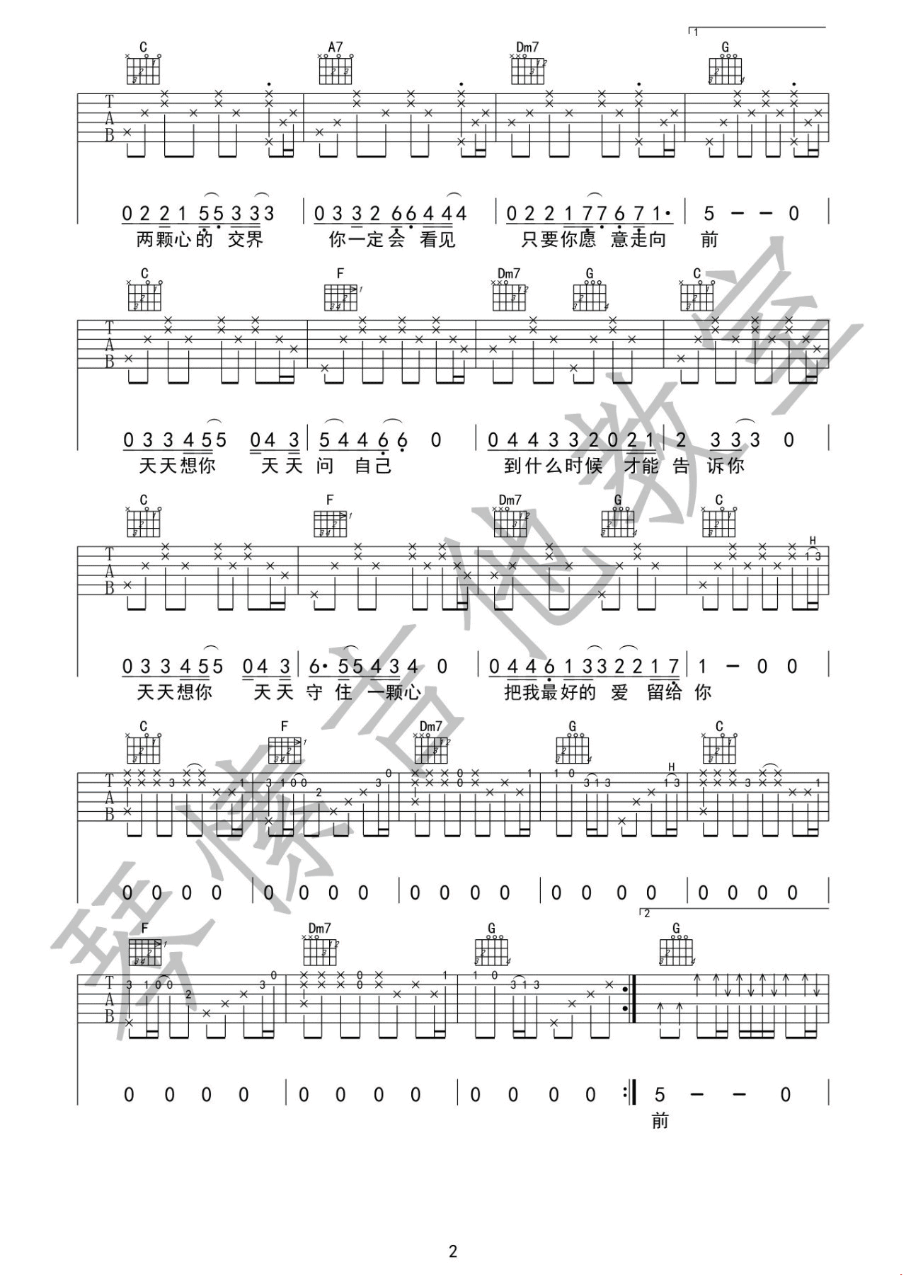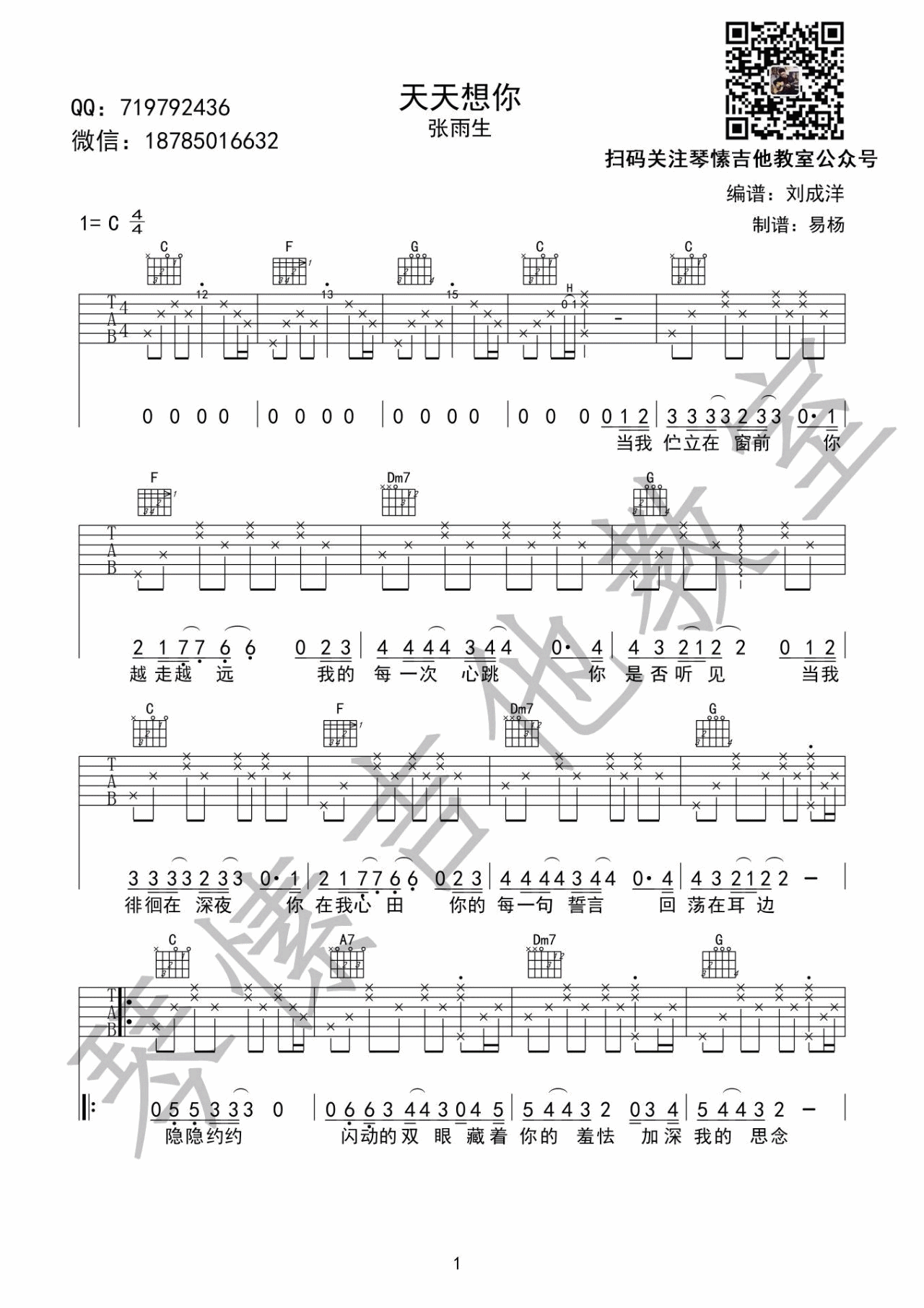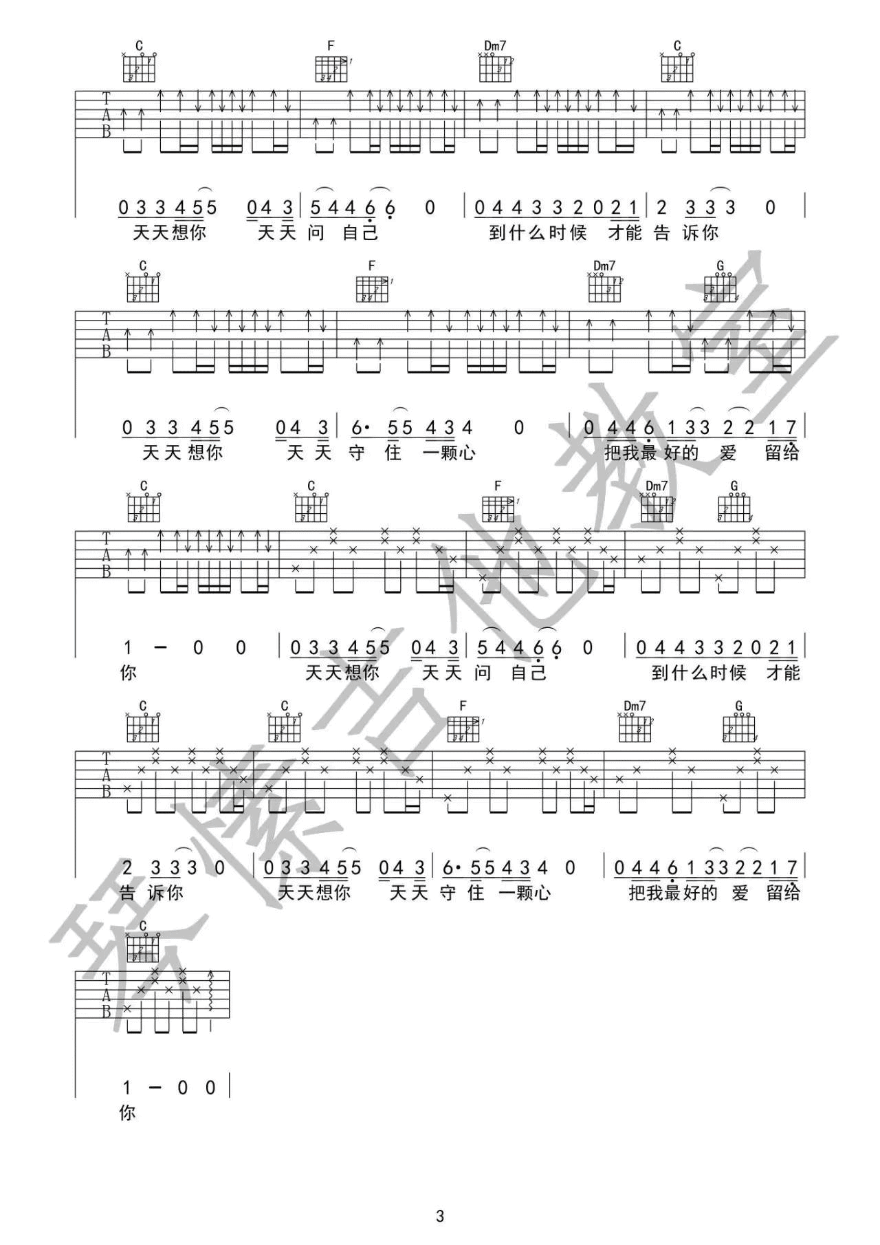 曲谱介绍: 张雨生《天天想你》吉他弹唱谱,采用C调指法编配,琴愫吉他编配出品,共有3张高清图谱。
