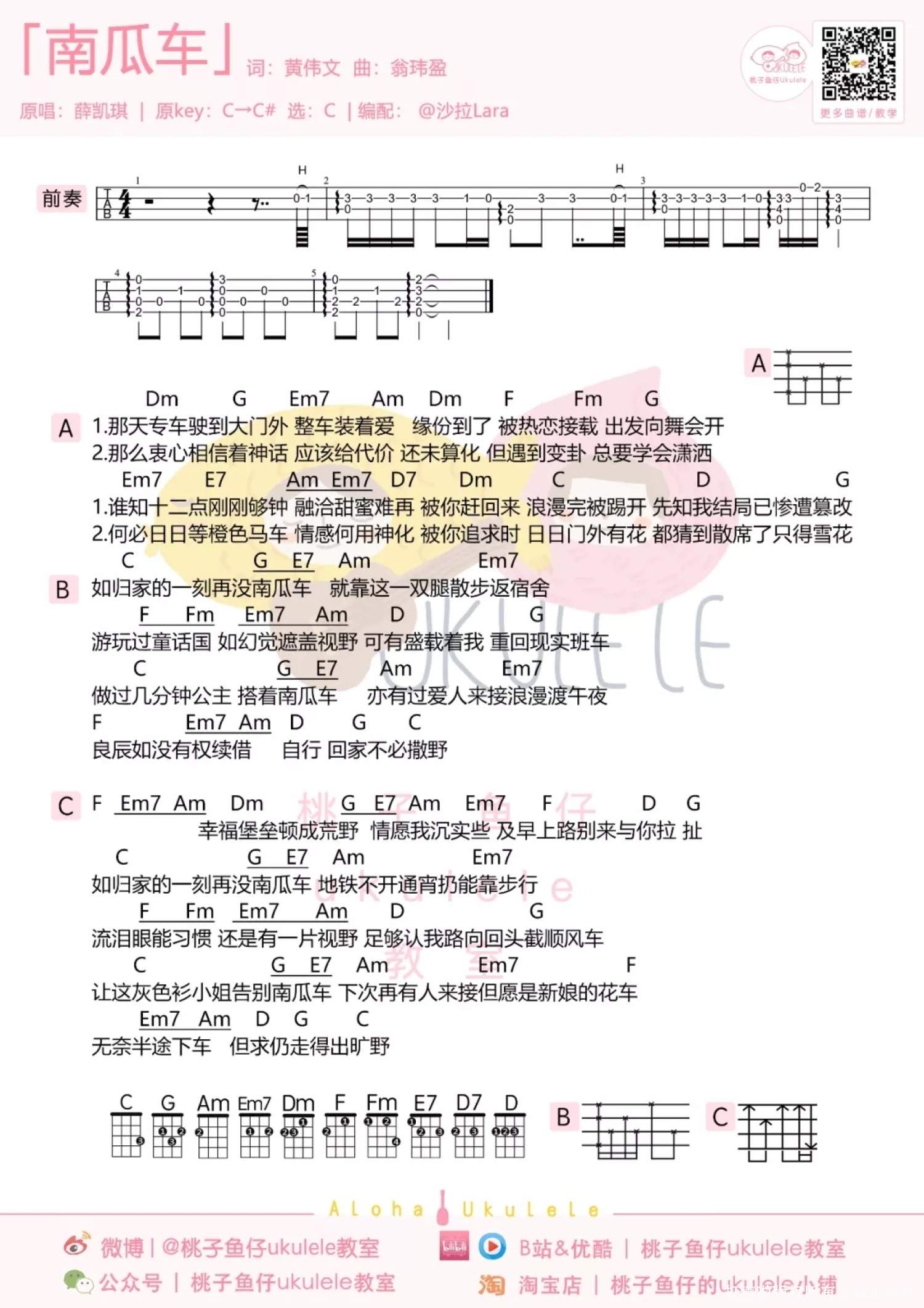 曲谱介绍: 没有南瓜车,就勇敢地自己走回家吧~   ukulele 弹唱演示 有人说薛凯琪是“香港最后的少女”,我觉得这形容很妙,因为自她以后真的再没有一个香港的女明星能给人们留下这样深刻的、混杂着天真与娇媚的少女印象了。   尤克里里弹唱教学   南瓜车 尤克里里谱