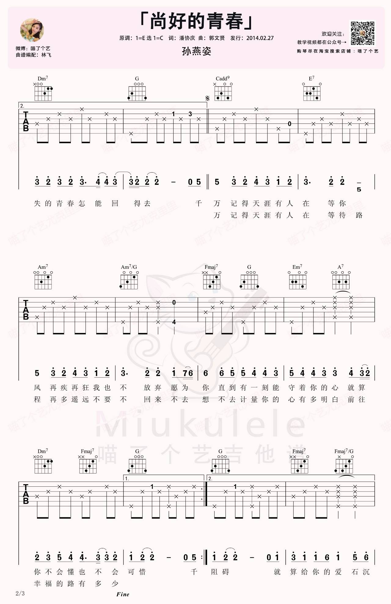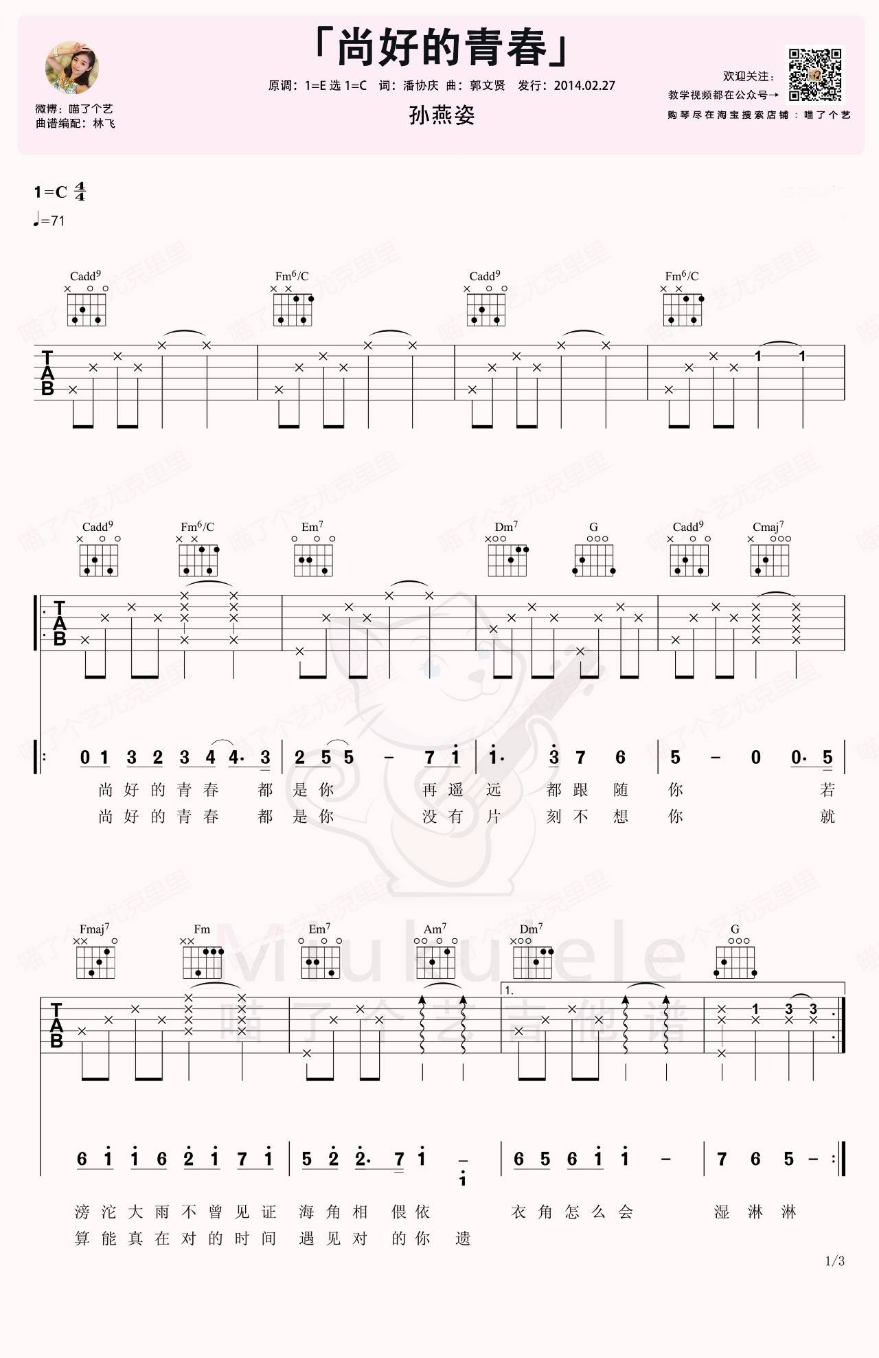 曲谱介绍: 孙燕姿《尚好的青春》吉他弹唱谱,采用C调指法编配,喵了个艺编配出品,共有3张高清图谱。