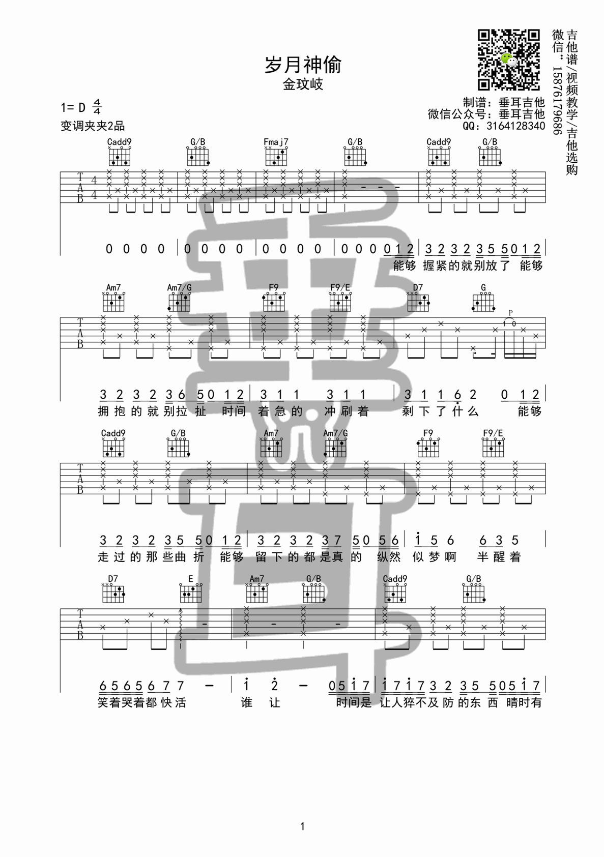 曲谱介绍: 金玟岐《岁月神偷》吉他弹唱谱,采用D调指法编配,垂耳吉他编配出品,共有2张高清图谱,免翻页排版设计。