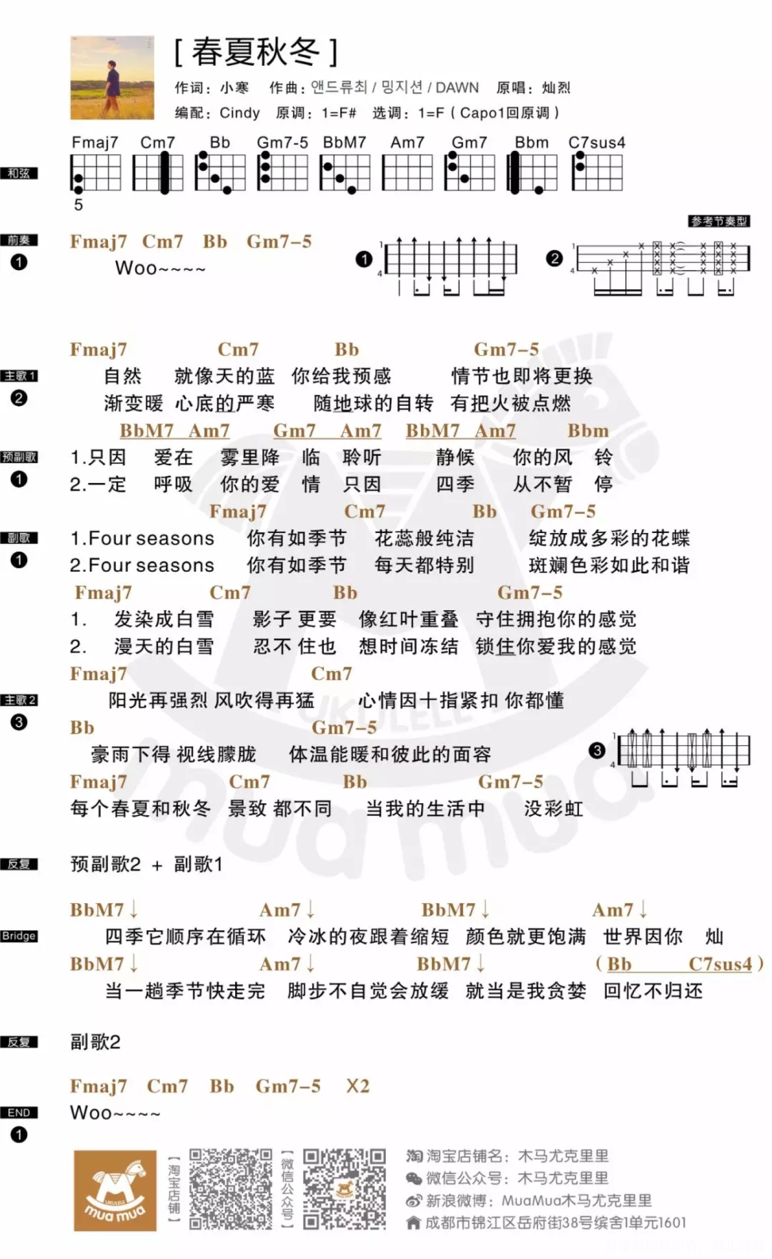 曲谱介绍: 这首歌曲是通过SM STATION项目发表的,「SM STATION」是SM公司2016年娱乐跳脱传统专辑发行方式,以1年52周,每周推出全新数位单曲,并透过与多方艺人、制作人、作曲家合作,进行品牌与品牌之间交流,发行音乐作品的计划。 之前有非常多艺人通过SM STATION发行过SOLO单曲或合作单曲,歌曲质量都不错。EXO的大哥XIUMIN也在入伍后,于5月9日首次通过该平台发布了他的单曲《이유 》(You),希望大哥在军营一切顺利~~ 个人感觉这次《春夏秋冬》的中文版填词很好,非常流畅好听,而且烈烈的发音挺标准,其他歌词版本也很良心,今天给大家带来中文版的翻唱。   MV MV在美丽的关岛取景,蓝天白云水清沙白,十足海岛风情又不失清新度假感,配合歌曲轻松慵懒的调调显得自在和惬意,让人心情愉悦。   COVER   春夏秋冬 尤克里里谱