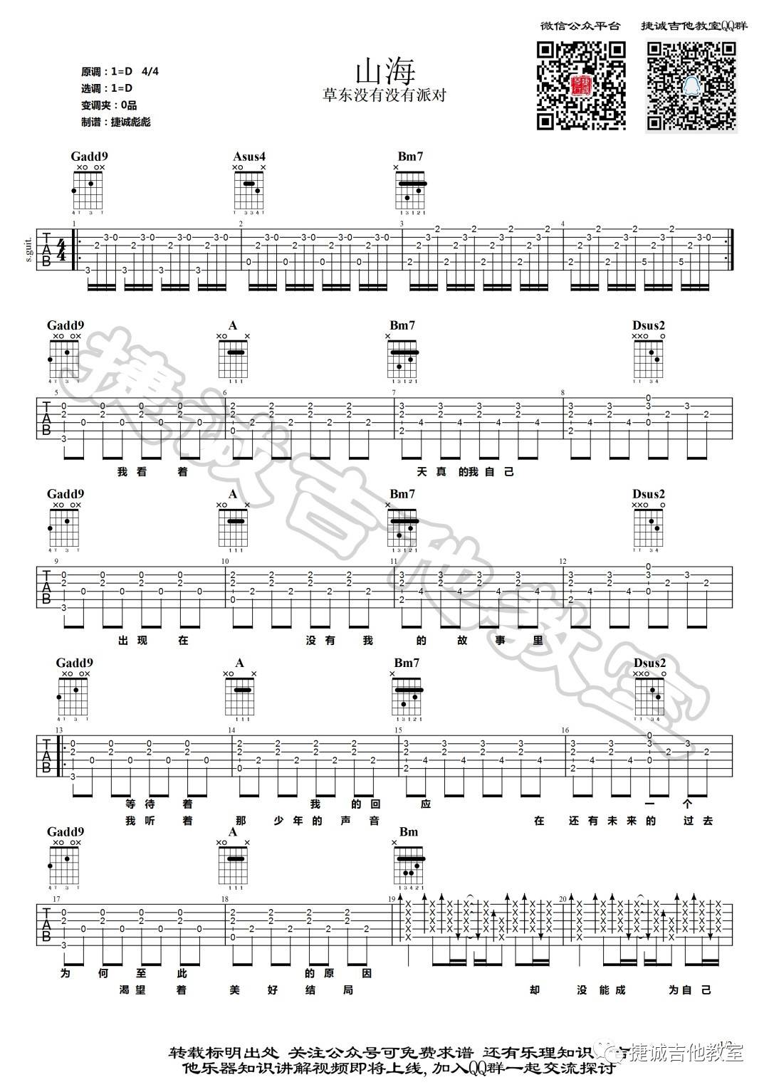 曲谱介绍: 草东没有派对《山海》吉他弹唱谱,采用D调指法编配,捷诚吉他教室编配出品,共有2张高清图谱,免翻页排版设计。