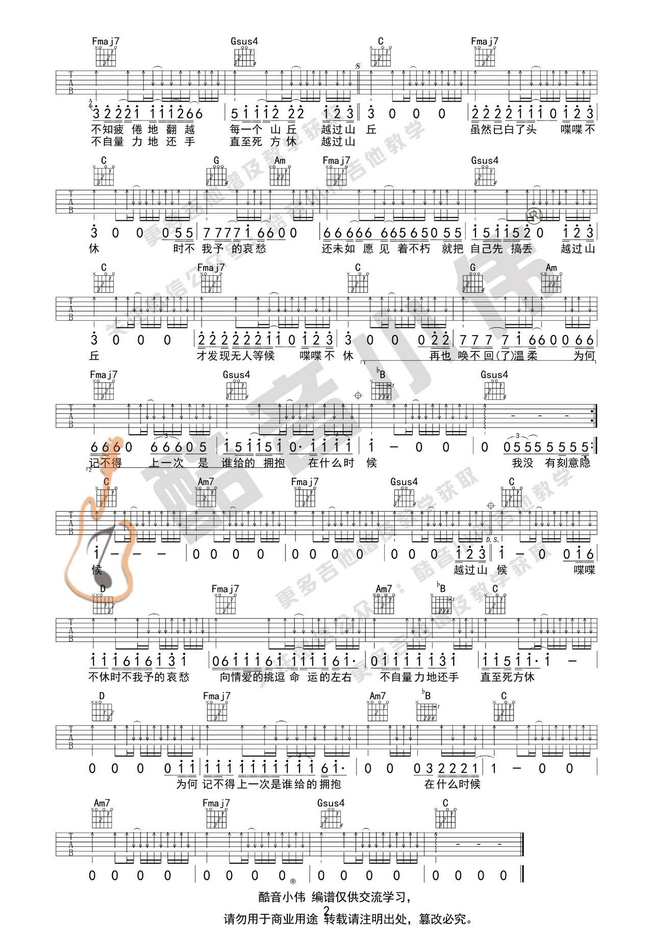曲谱介绍: 李宗盛《山丘》吉他弹唱谱,采用C调指法编配,酷音小伟编配出品,共有2张高清图谱,免翻页排版设计。