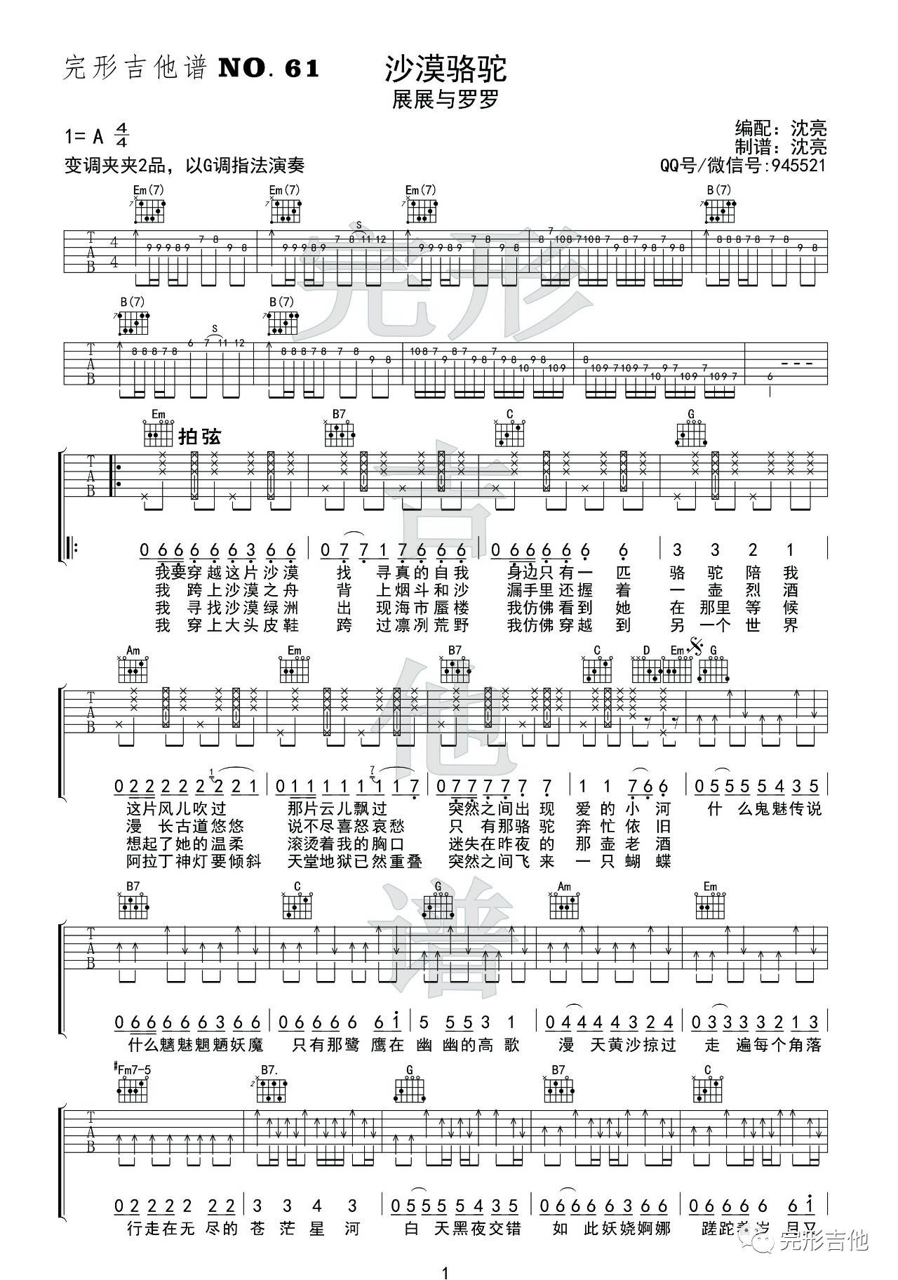 曲谱介绍: 展展与罗罗《沙漠骆驼》吉他弹唱谱,采用G调指法编配,完形吉他编配出品,共有2张高清图谱,免翻页排版设计。