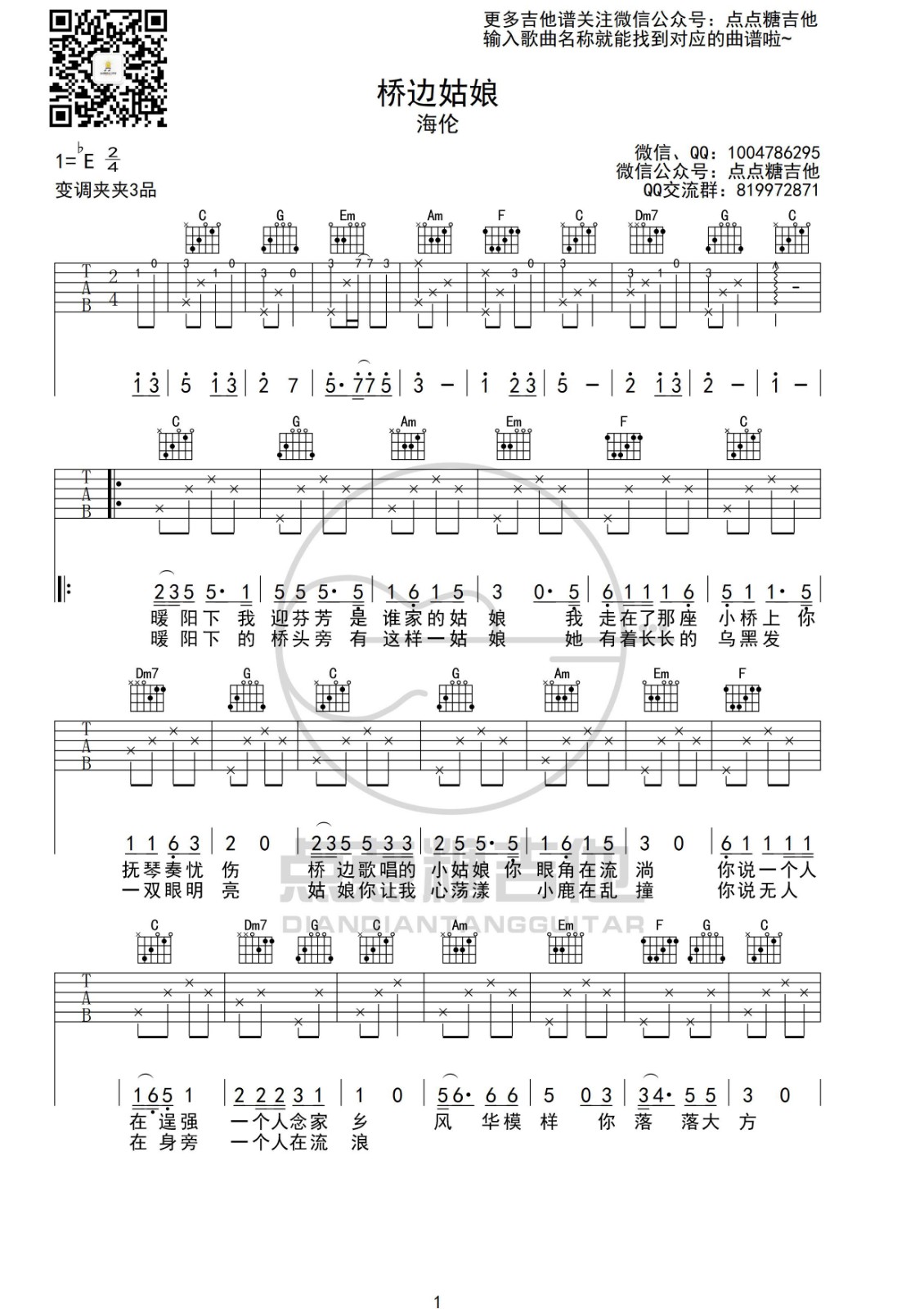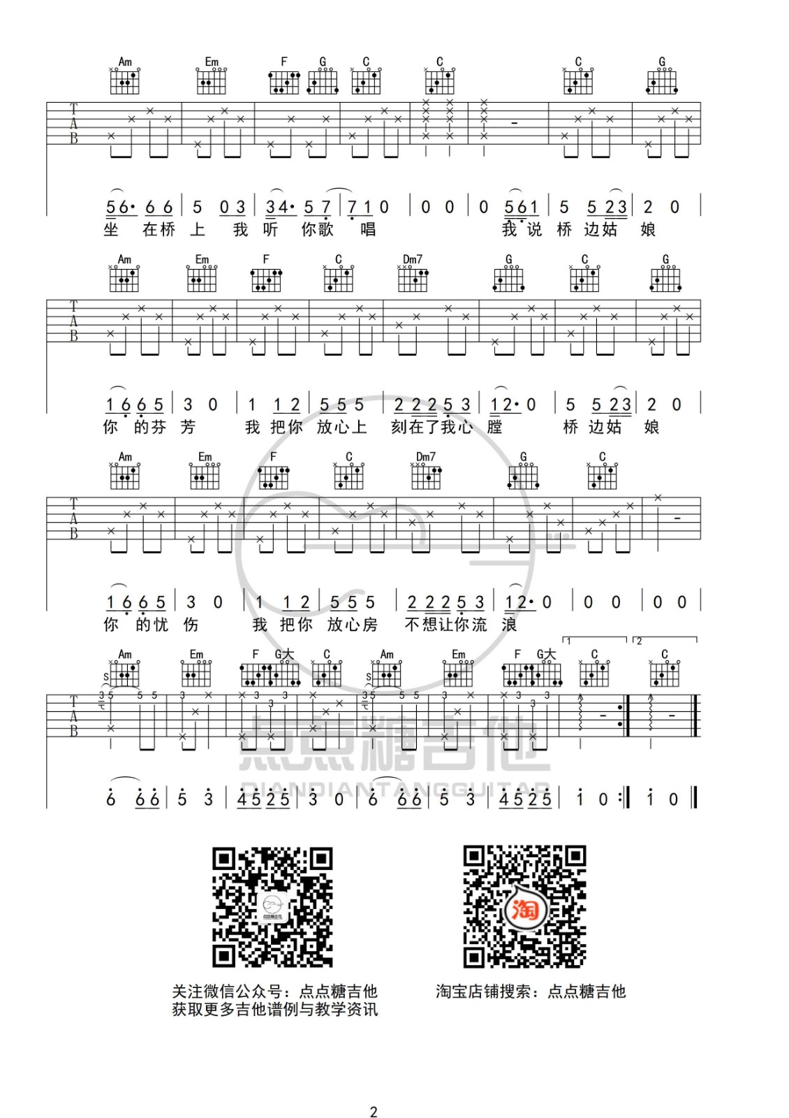 曲谱介绍: 海伦《桥边姑娘》吉他弹唱谱,采用C调指法编配,点点糖吉他编配出品,共有2张高清图谱,免翻页排版设计。