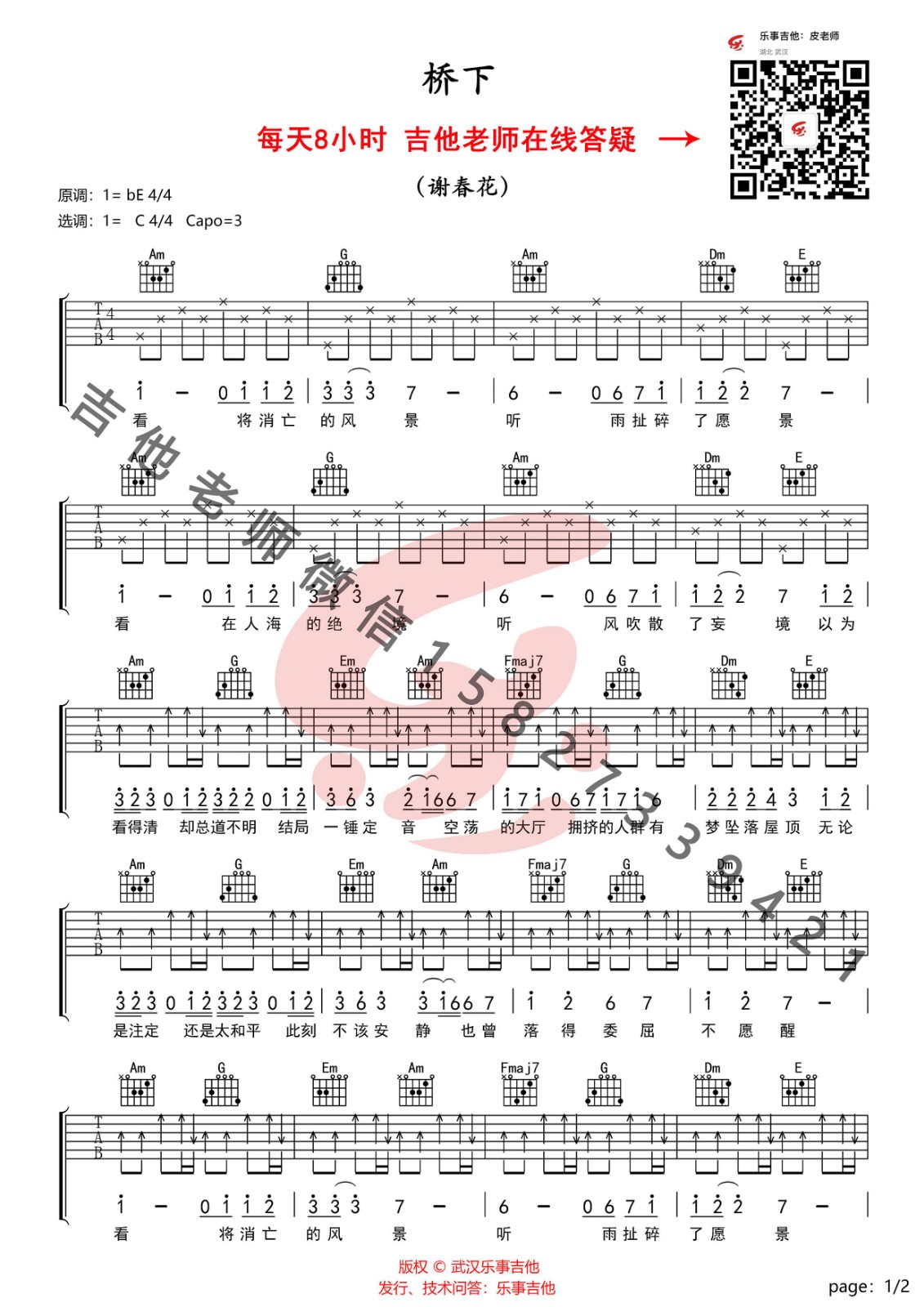 曲谱介绍: 谢春花《桥下》吉他弹唱谱,采用C调指法编配,乐事吉他编配出品,共有2张高清图谱,免翻页排版设计。