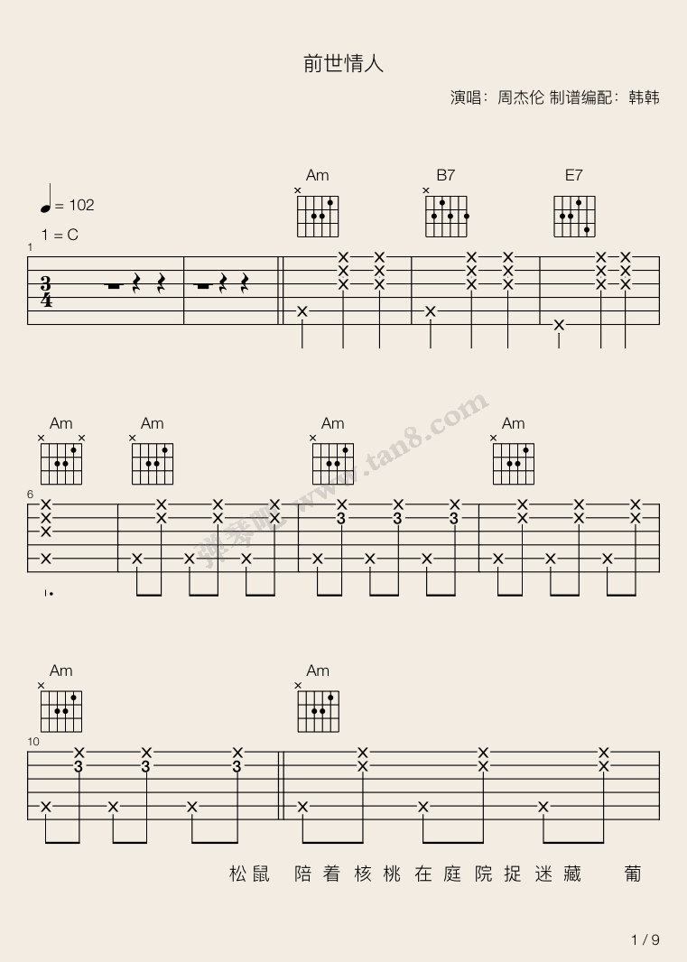 曲谱介绍: 周杰伦《前世情人》吉他弹唱谱,采用C调指法编配,弹琴吧编配出品,共有9张高清图谱。