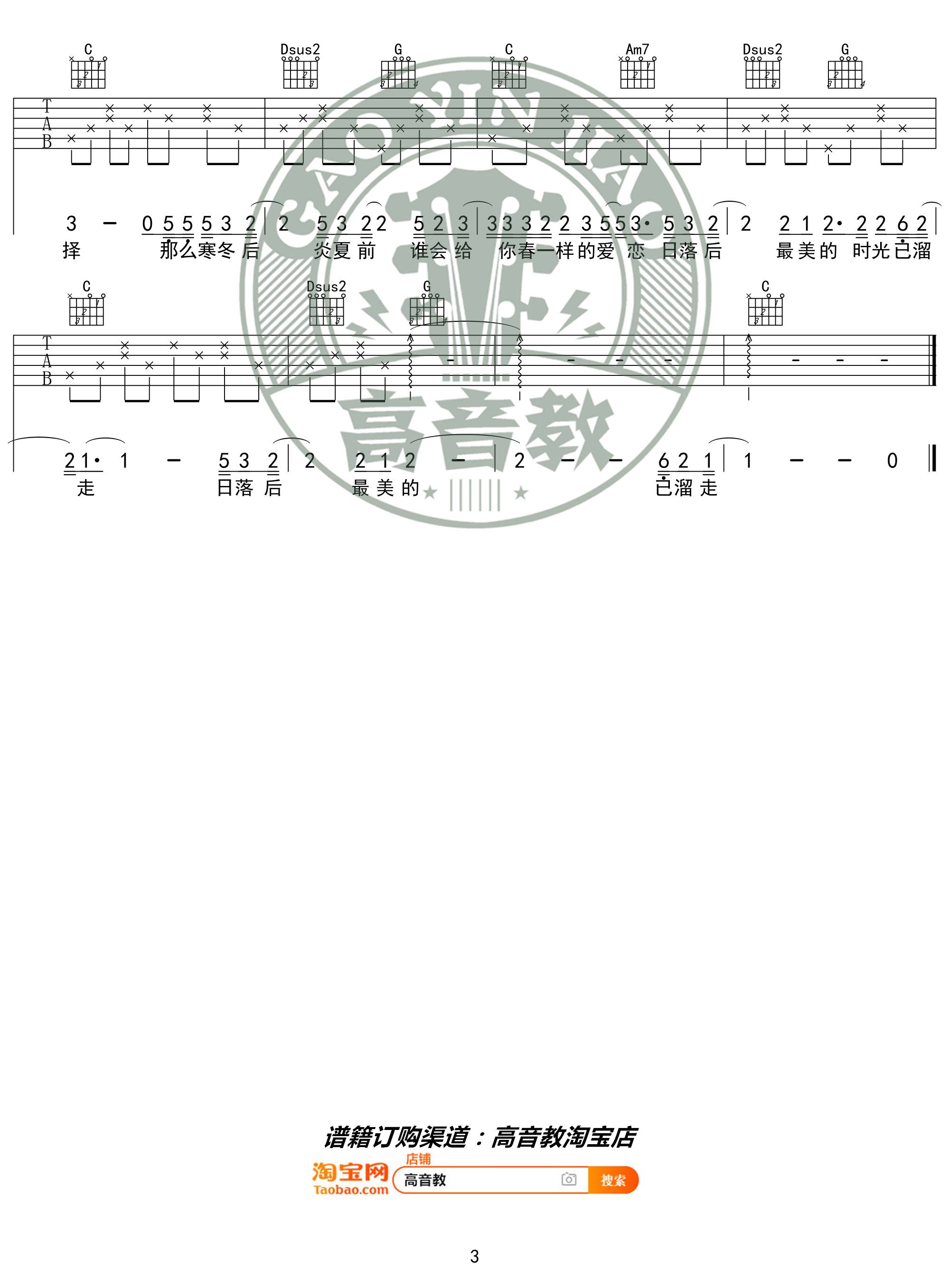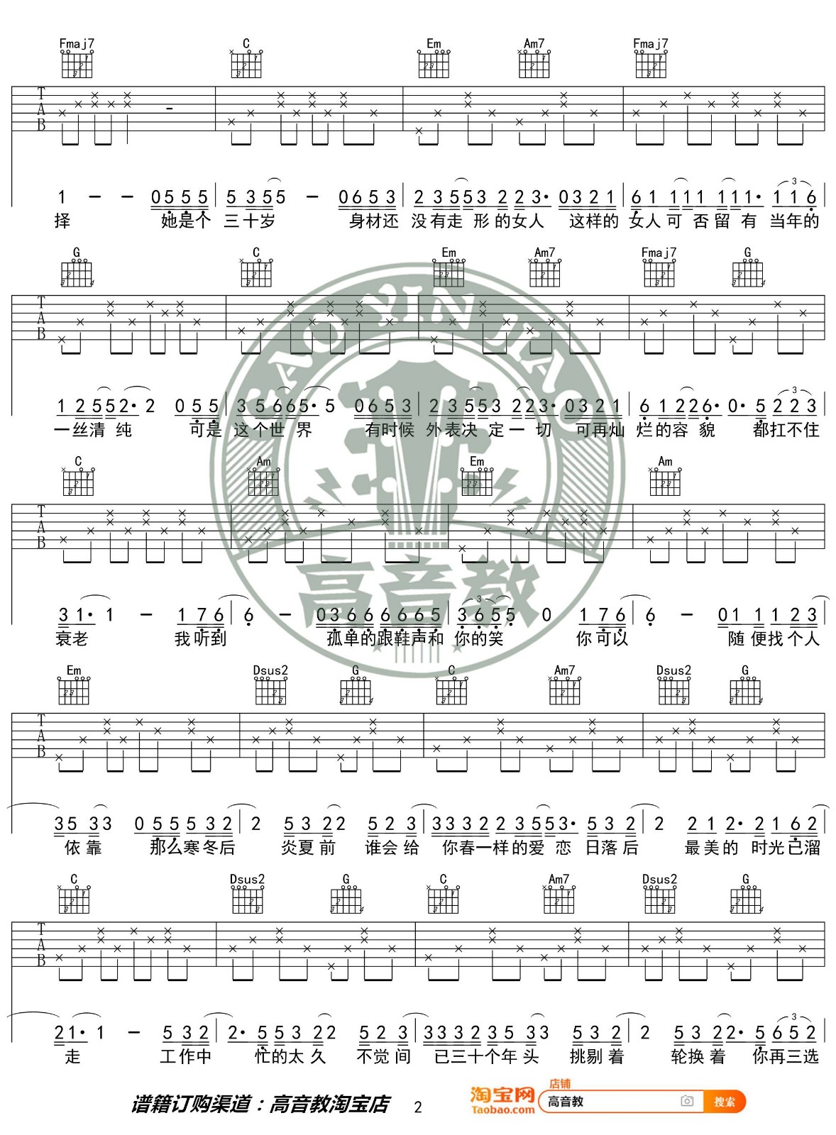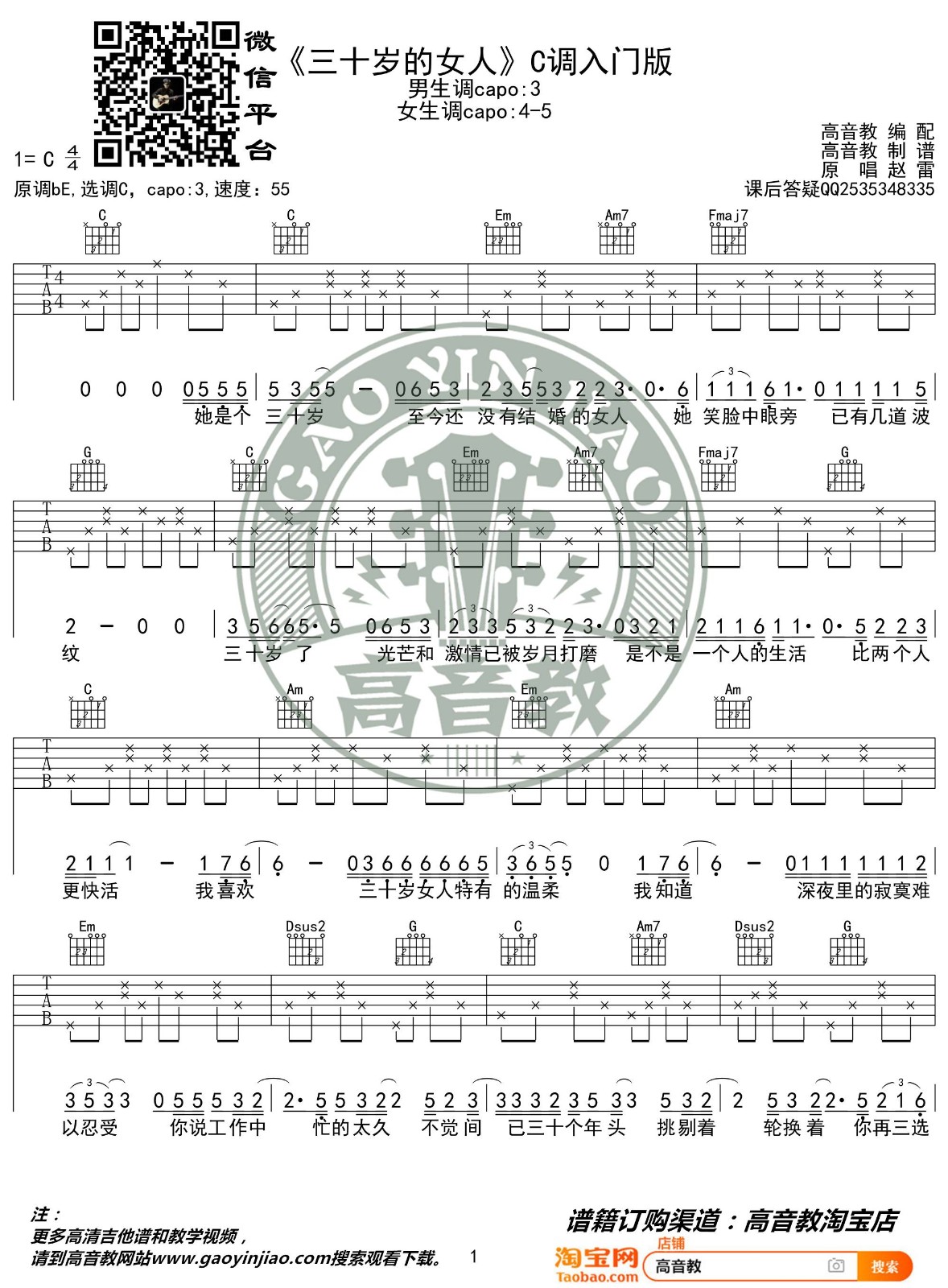 曲谱介绍: 赵雷《三十岁的女人》吉他弹唱谱,采用C调指法编配,高音教编配出品,共有3张高清图谱。