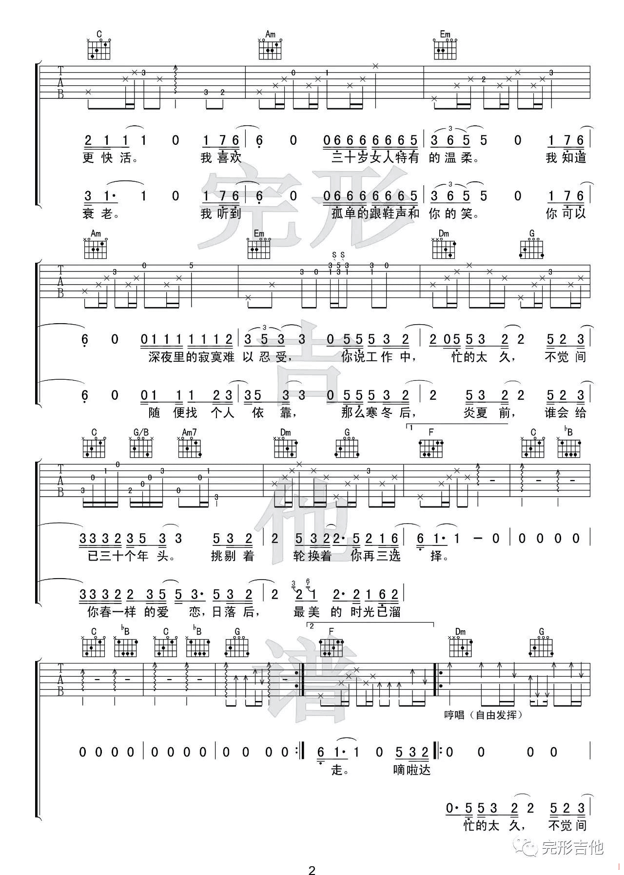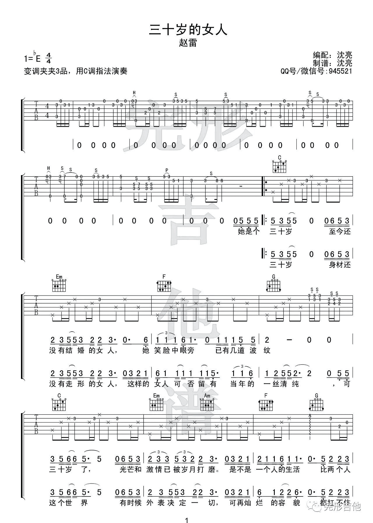 曲谱介绍: 赵雷《三十岁的女人》吉他弹唱谱,采用C调指法编配,完形吉他编配出品,共有3张高清图谱。