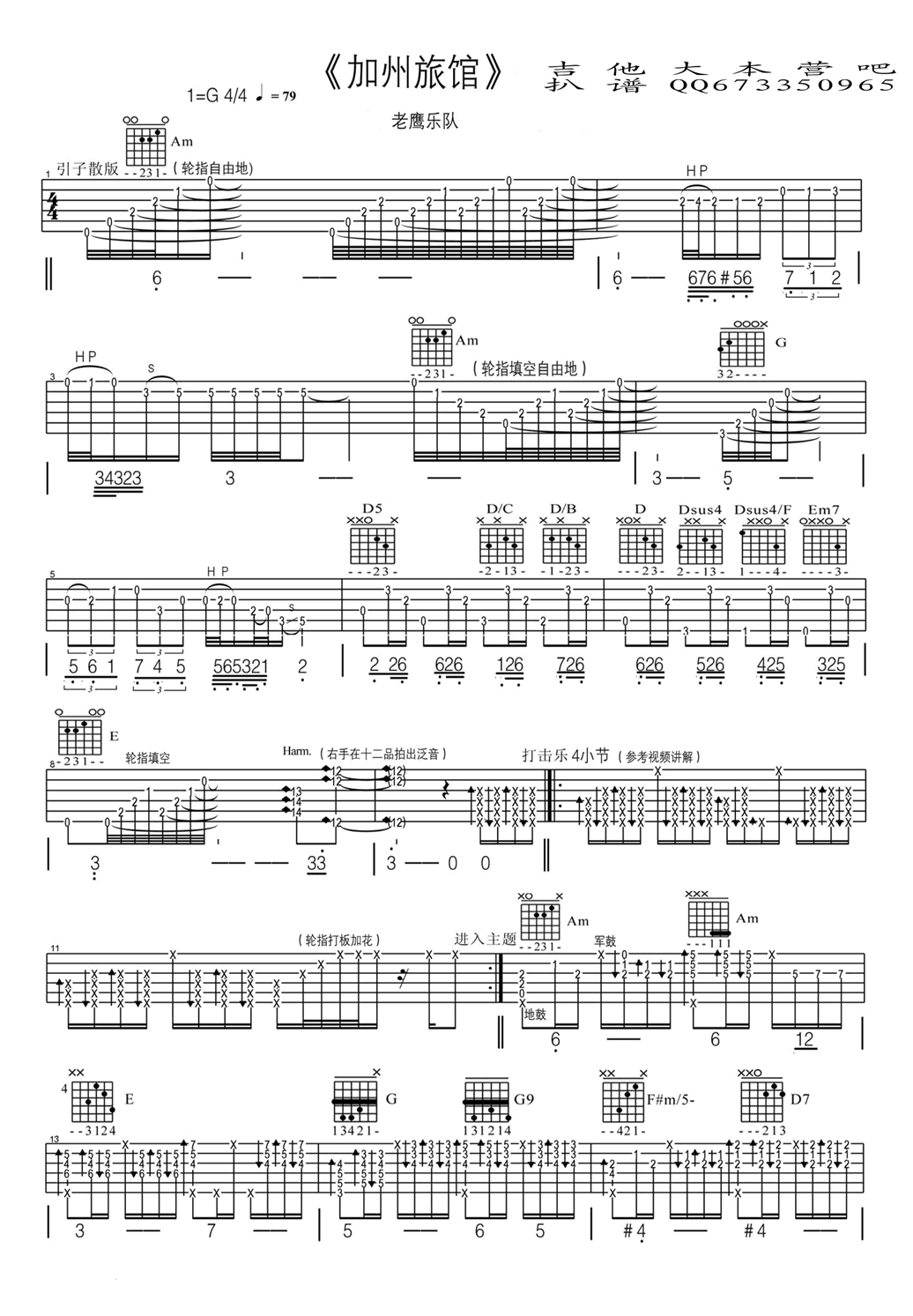 曲谱介绍: 老鹰乐队《加州旅馆》吉他独奏谱,吉他大本营编配出品,共有6张高清图谱。