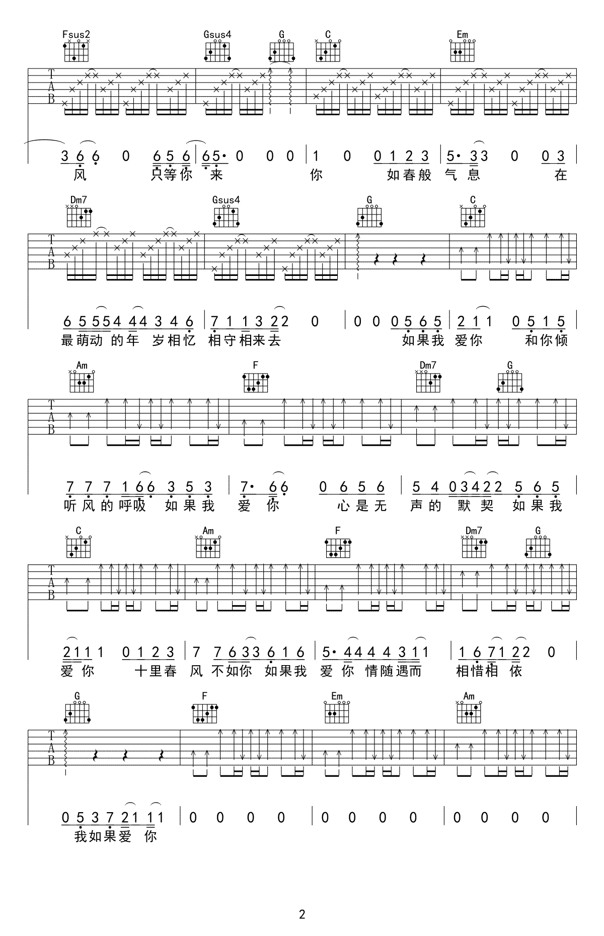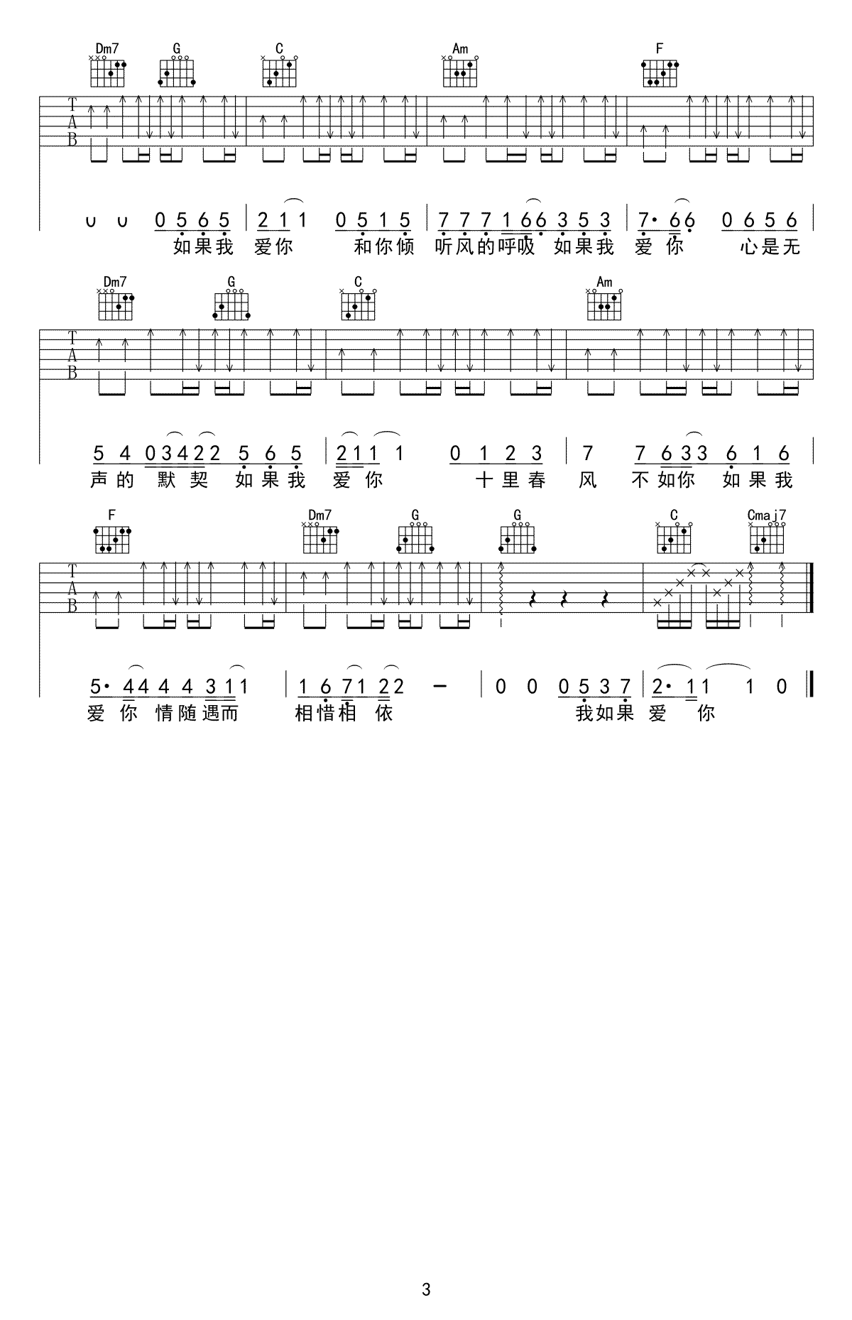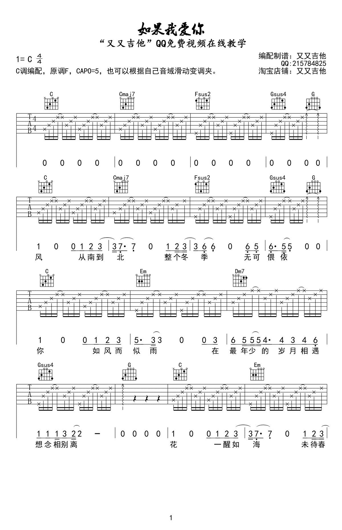 曲谱介绍: 张一山《如果我爱你》吉他弹唱谱,采用C调指法编配,又又吉他编配出品,共有3张高清图谱。