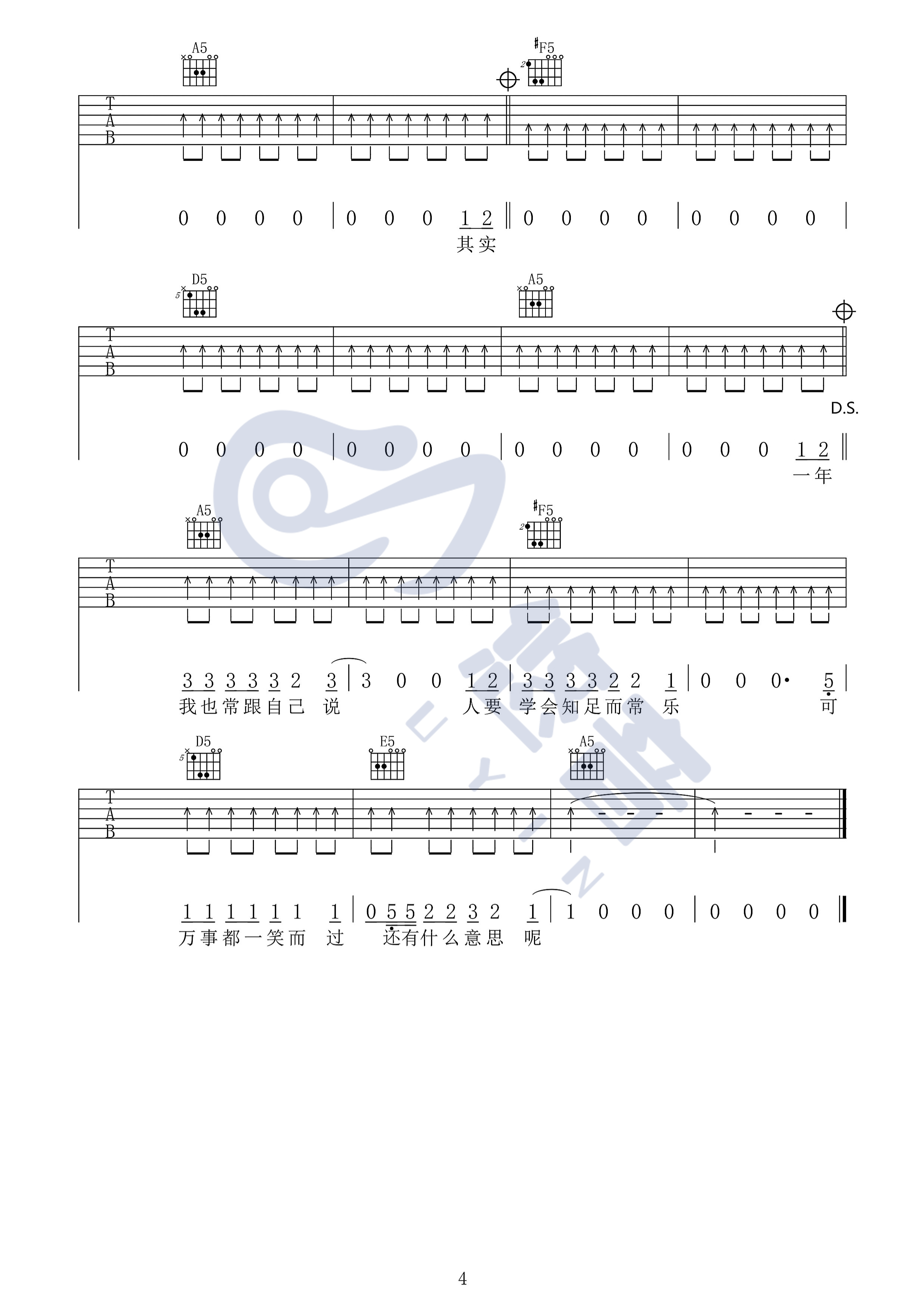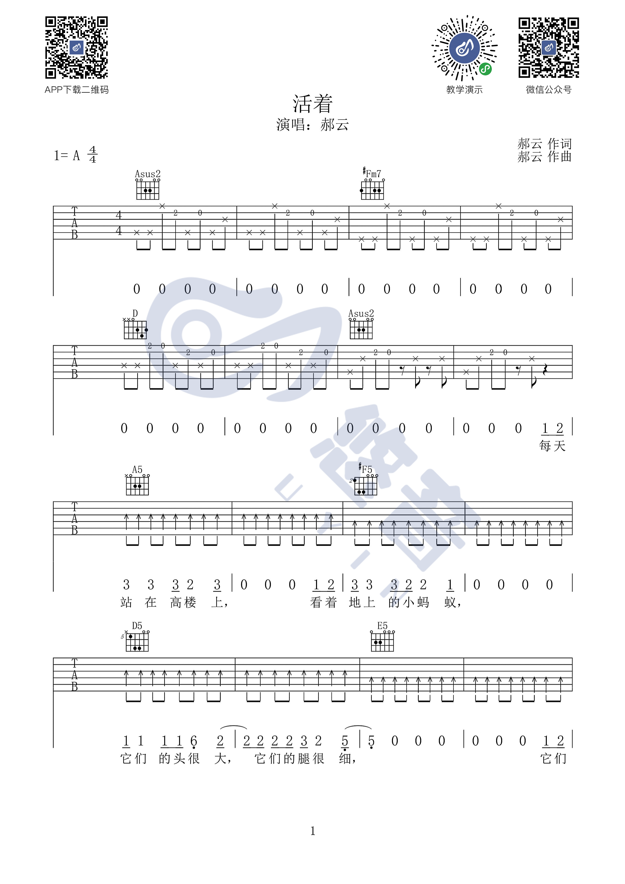 曲谱介绍: 郝云《活着》吉他弹唱谱,采用A调指法编配,悠音吉他课堂编配出品,共有4张高清图谱。