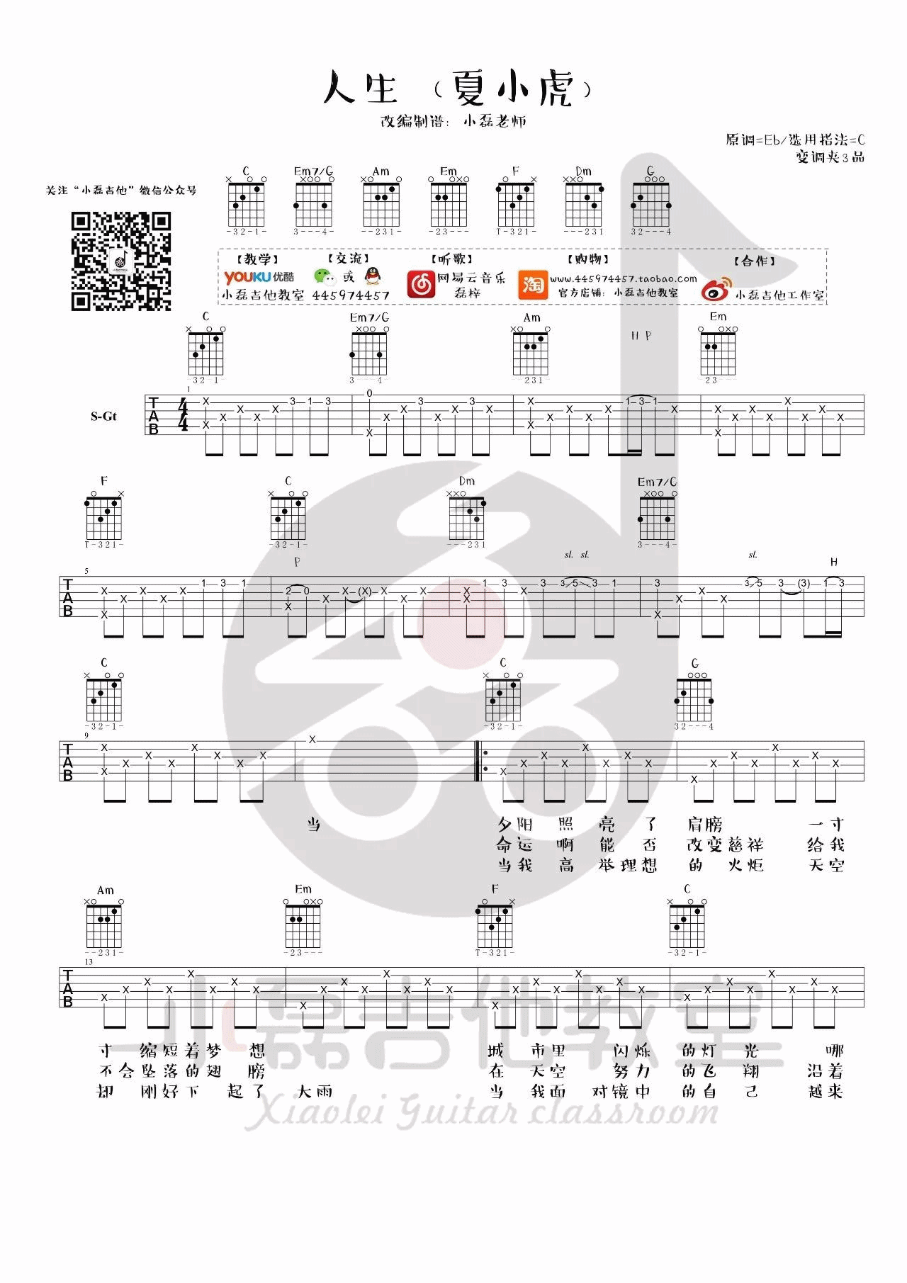 曲谱介绍: 带吉他教学《人生》吉他弹唱谱,采用C调指法编配,小磊吉他教室编配出品,共有5张高清图谱。
