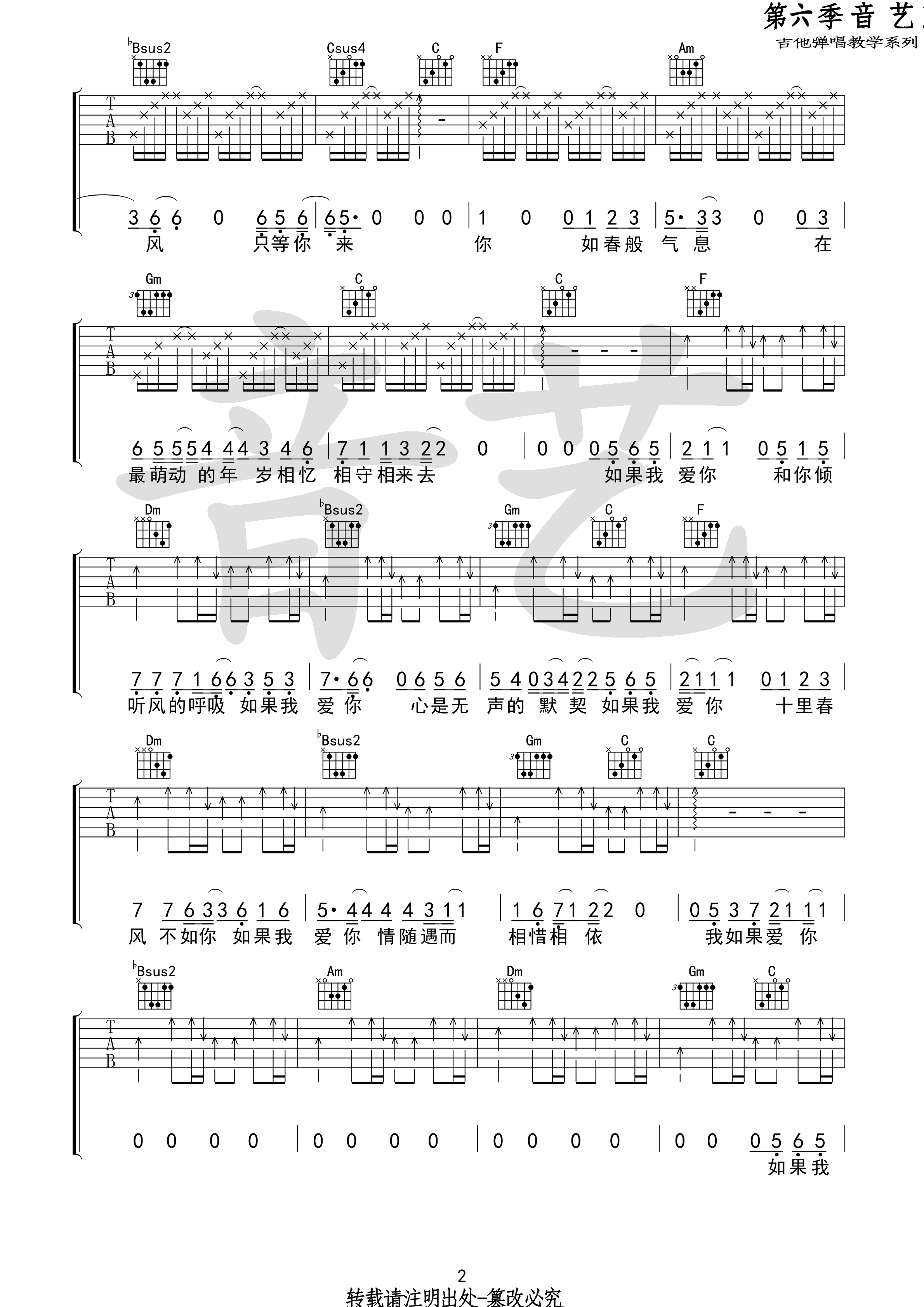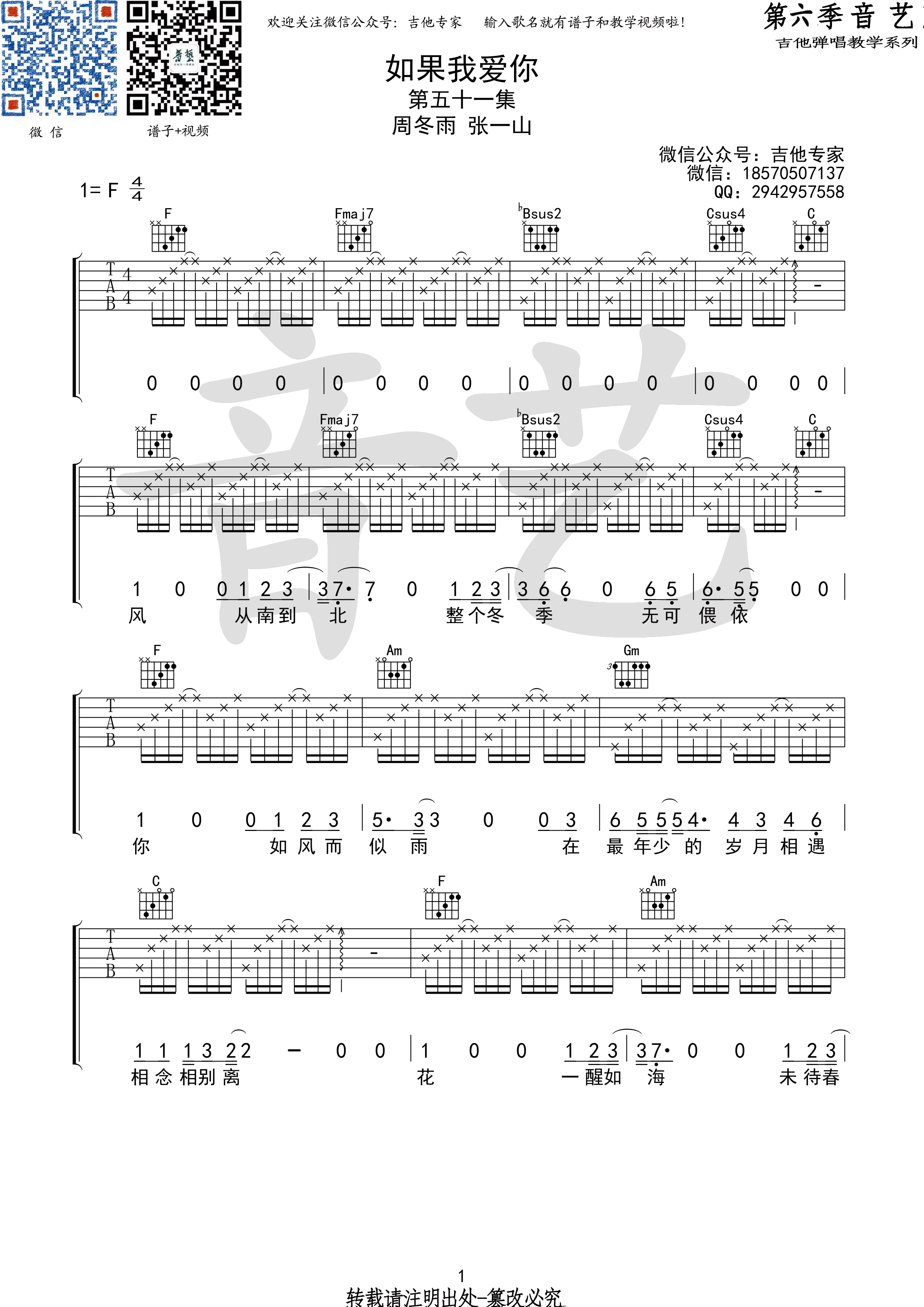 曲谱介绍: 周冬雨《如果我爱你》吉他弹唱谱,采用F调指法编配,音艺吉他编配出品,共有3张高清图谱。