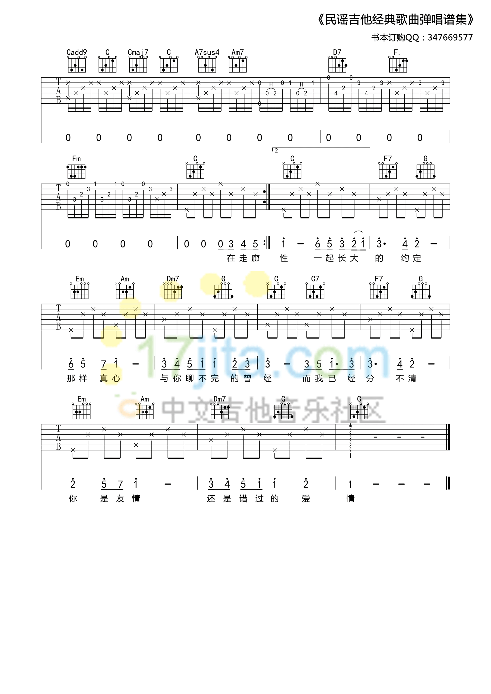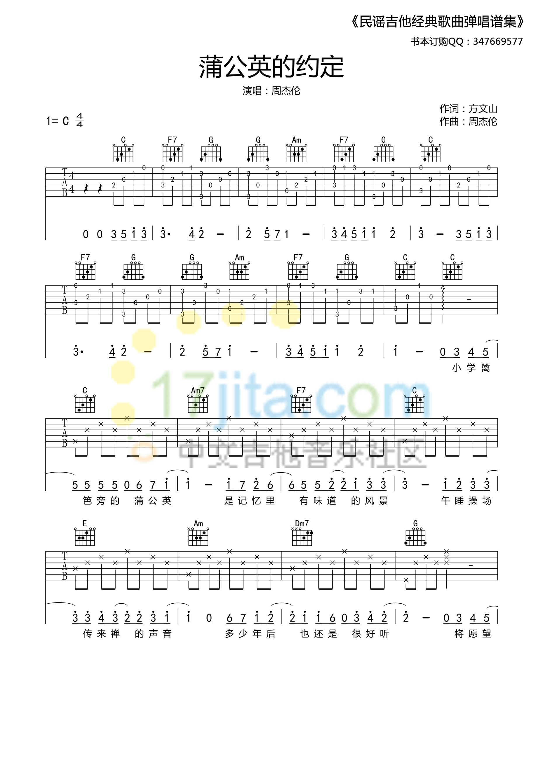 曲谱介绍: 周杰伦《蒲公英的约定》吉他弹唱谱,采用C调指法编配,17吉他编配出品,共有3张高清图谱。