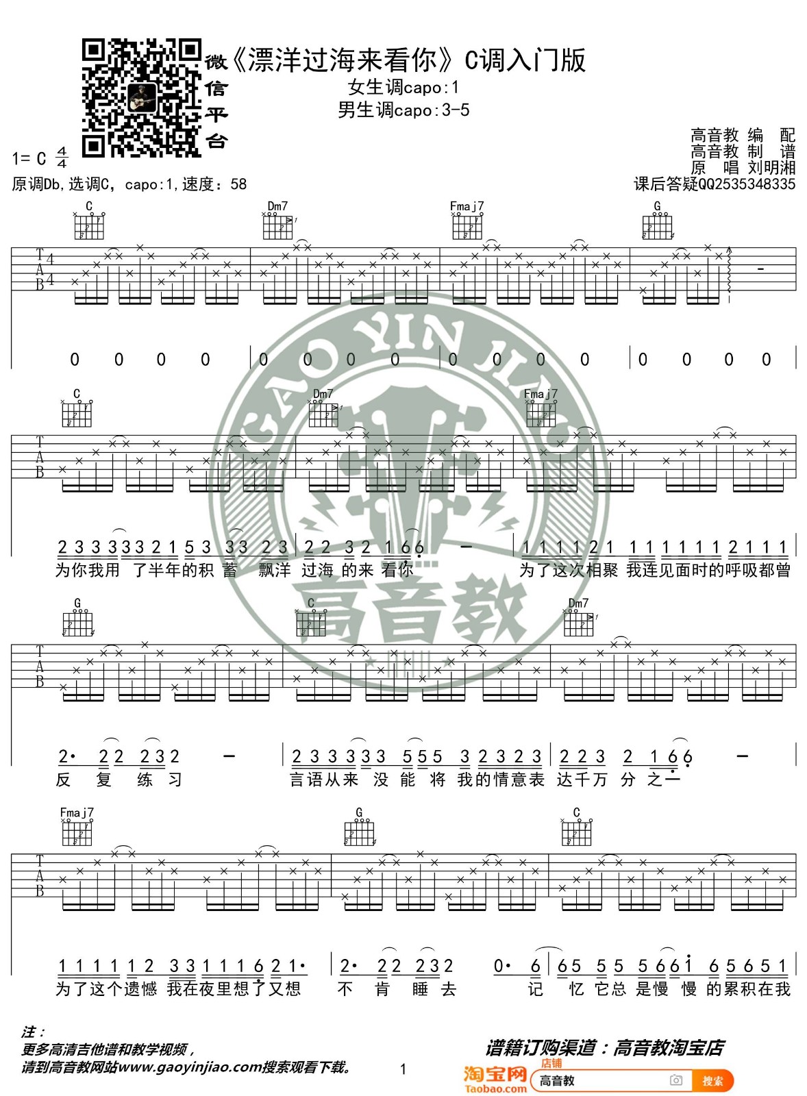曲谱介绍: 刘明湘《漂洋过海来看你》吉他弹唱谱,采用C调指法编配,高音教编配出品,共有2张高清图谱,免翻页排版设计。