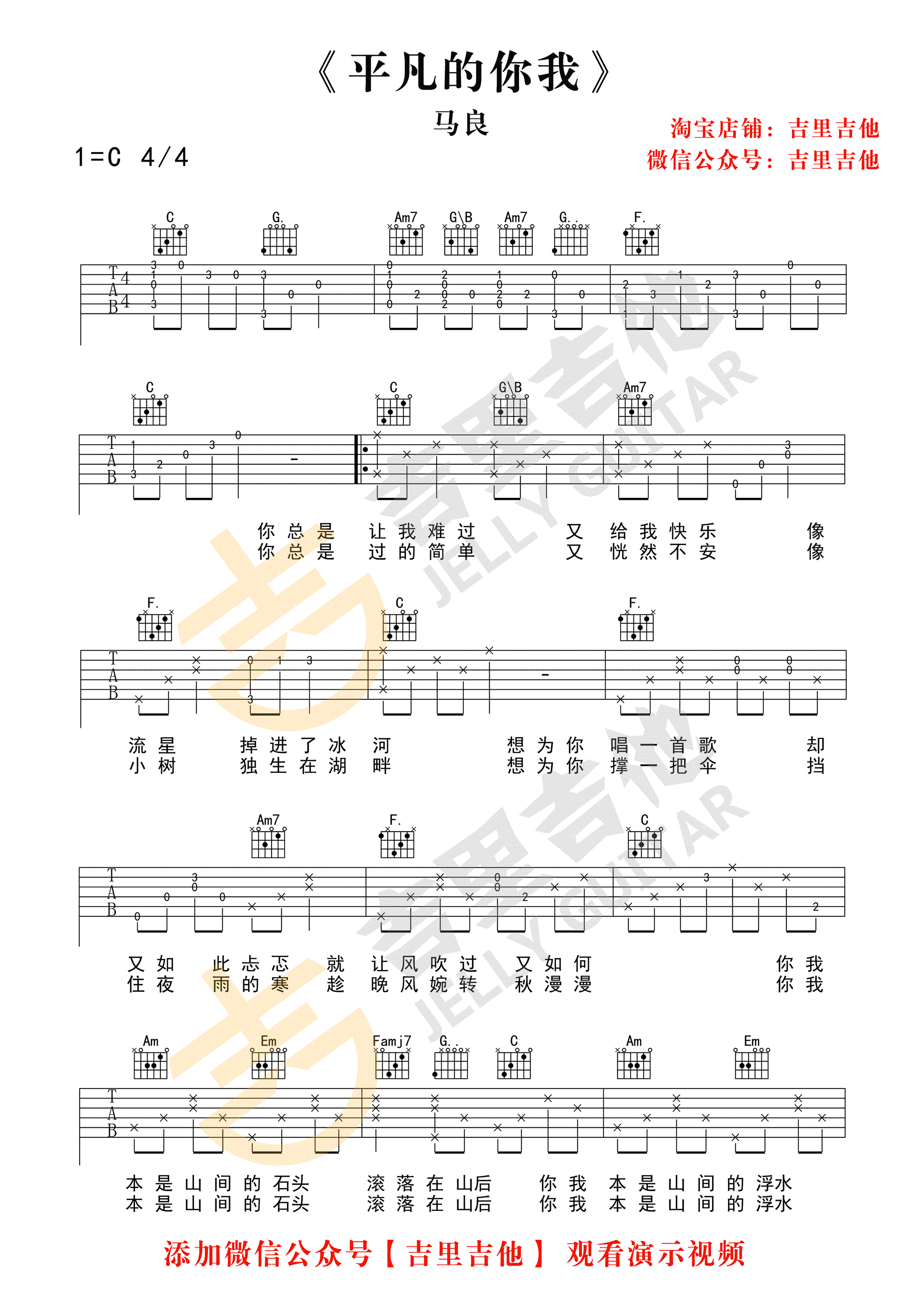 曲谱介绍: 马良《平凡的你我》吉他弹唱谱,采用C调指法编配,吉里吉他编配出品,共有2张高清图谱,免翻页排版设计。