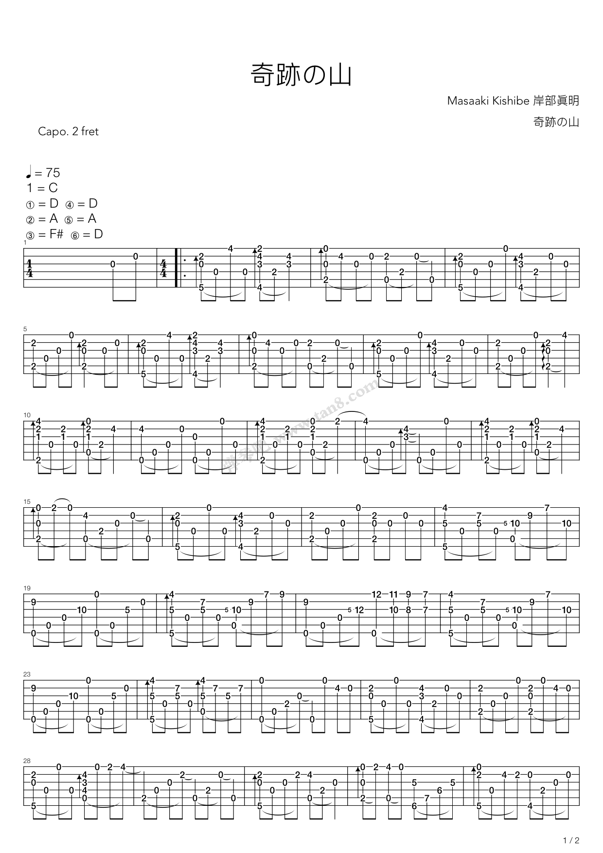 曲谱介绍: 岸部真明《奇迹的山》吉他独奏谱,采用C调指法编配,弹琴吧编配出品,共有2张高清图谱,免翻页排版设计。