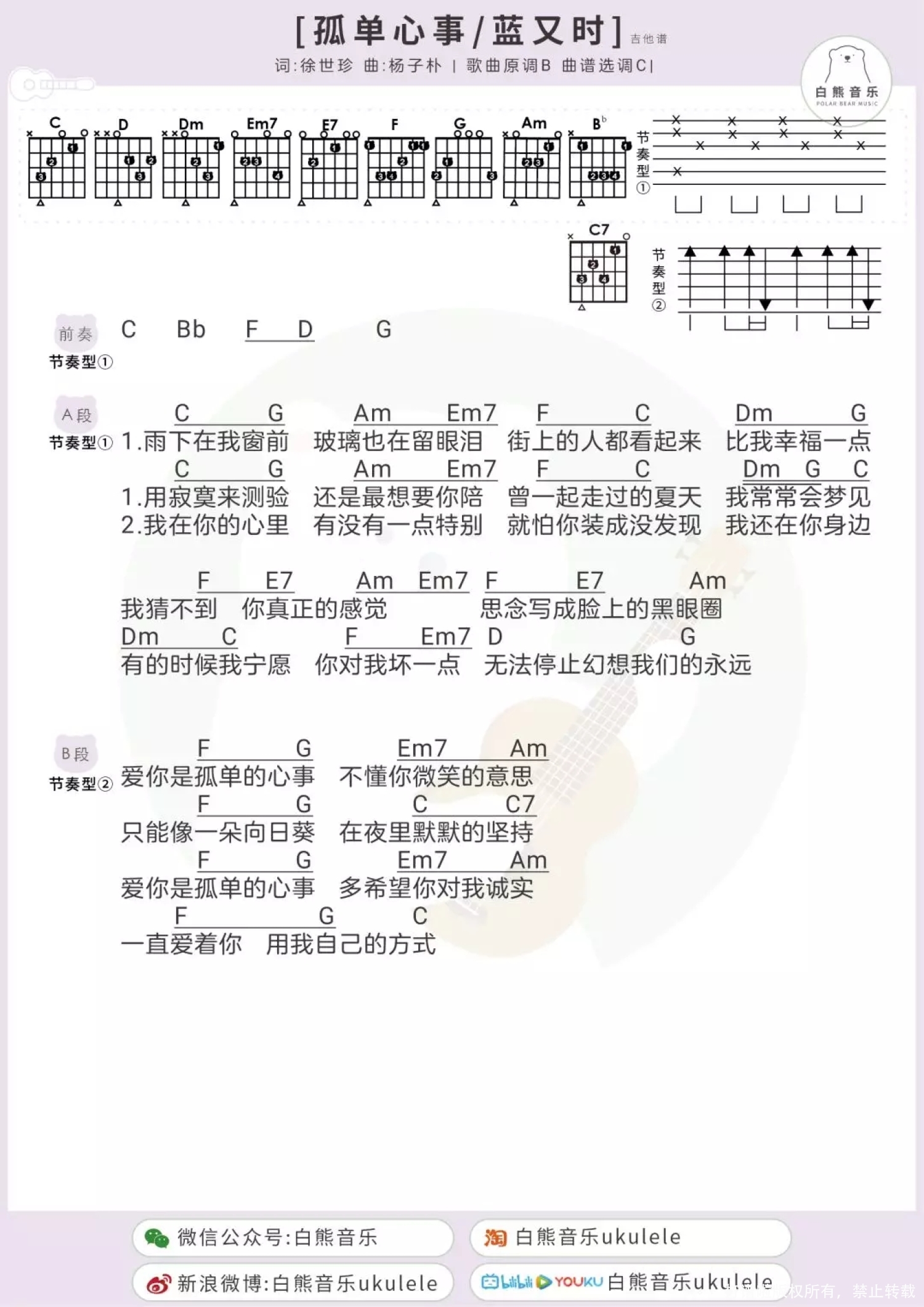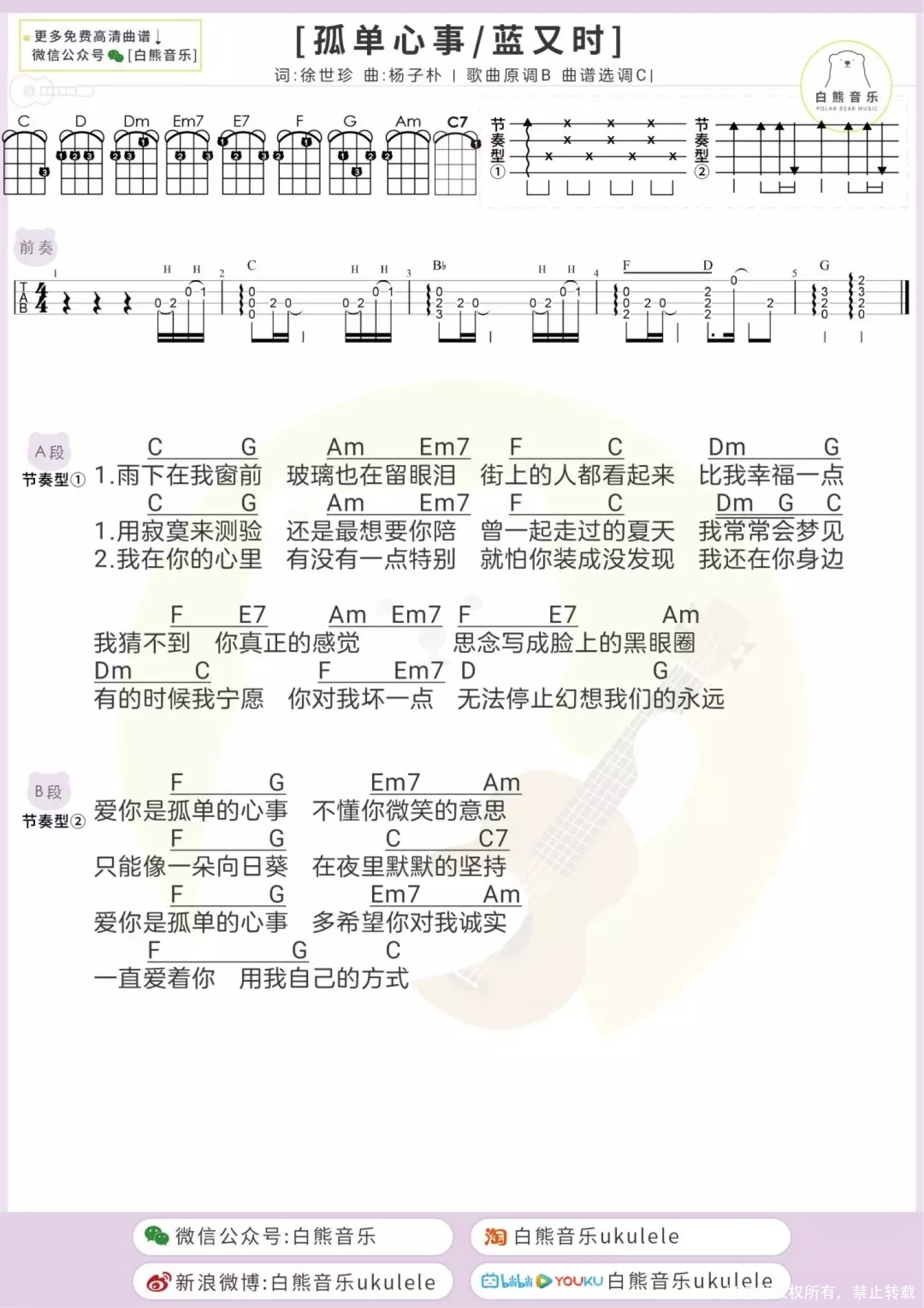 曲谱介绍: 蓝又时现场   孤单心事尤克里里谱:   孤单心事吉他谱: