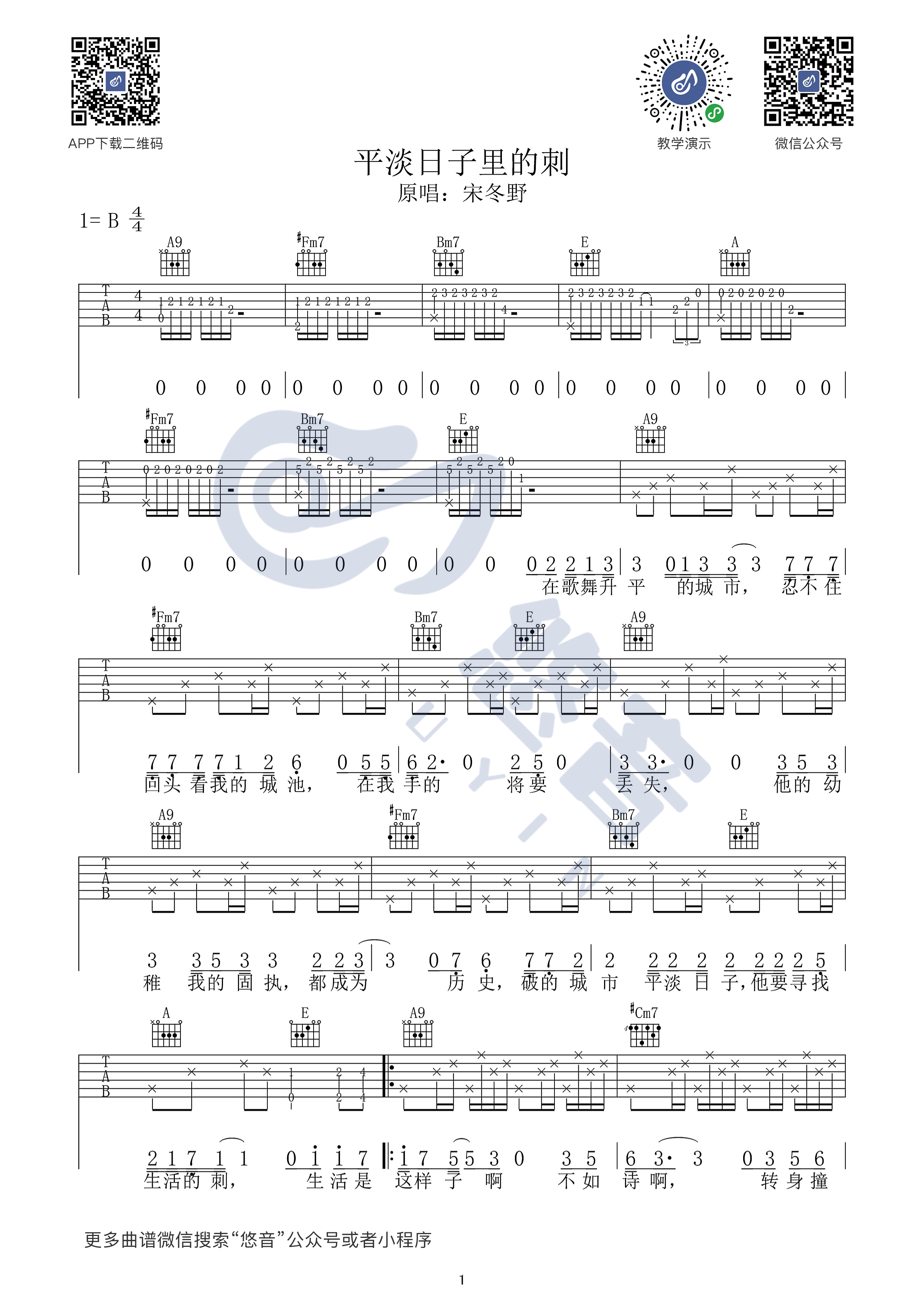 曲谱介绍: 宋冬野《平淡日子里的刺》吉他弹唱谱,采用B调指法编配原版,悠音吉他课堂编配出品,共有3张高清图谱。