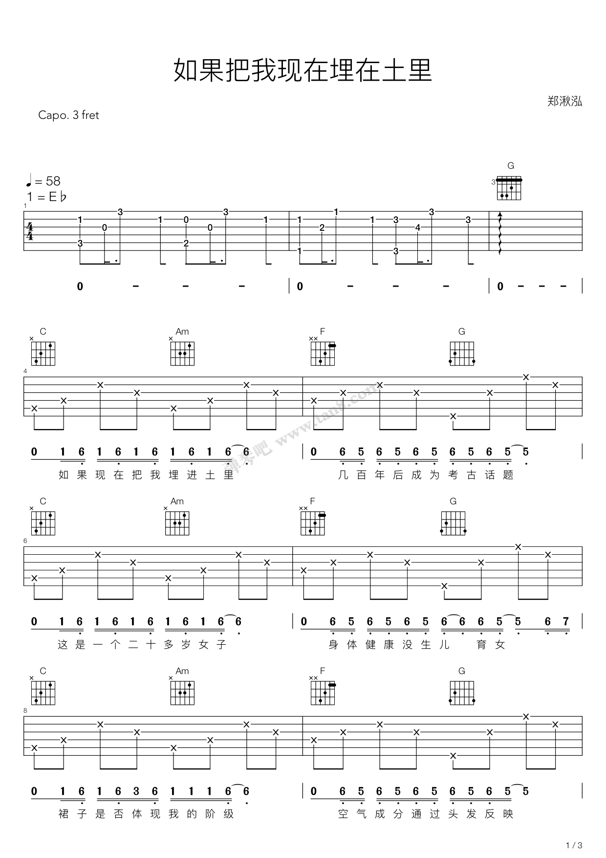 曲谱介绍: 郑湫泓《如果现在把我埋进土里》吉他弹唱谱,采用C调指法编配,弹琴吧编配出品,共有3张高清图谱。