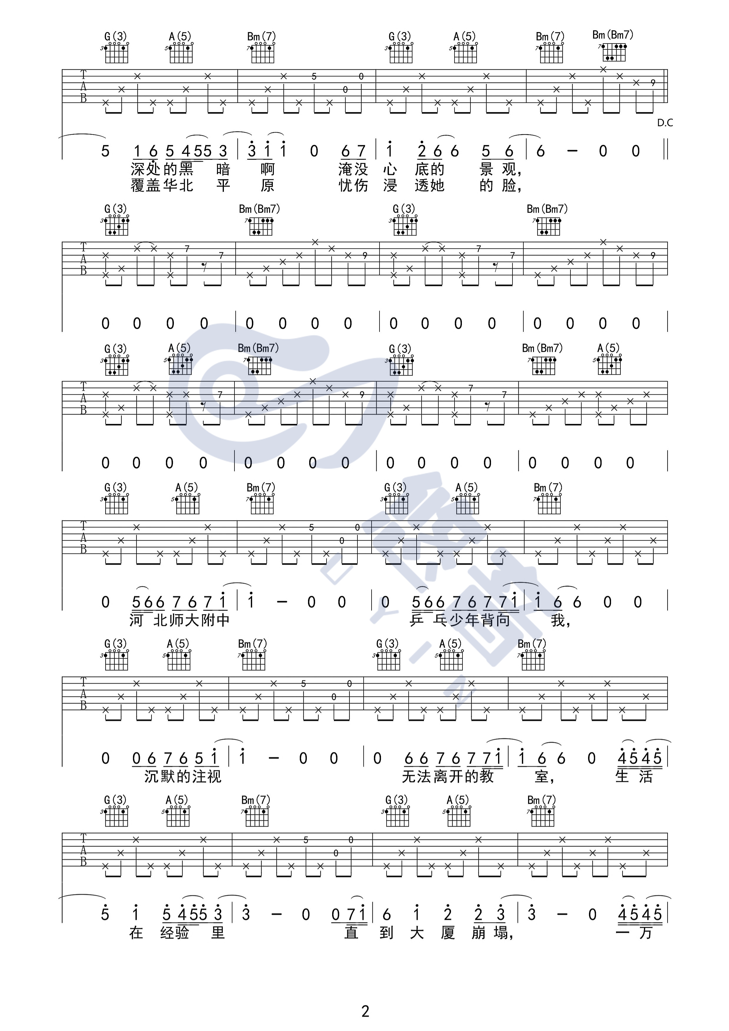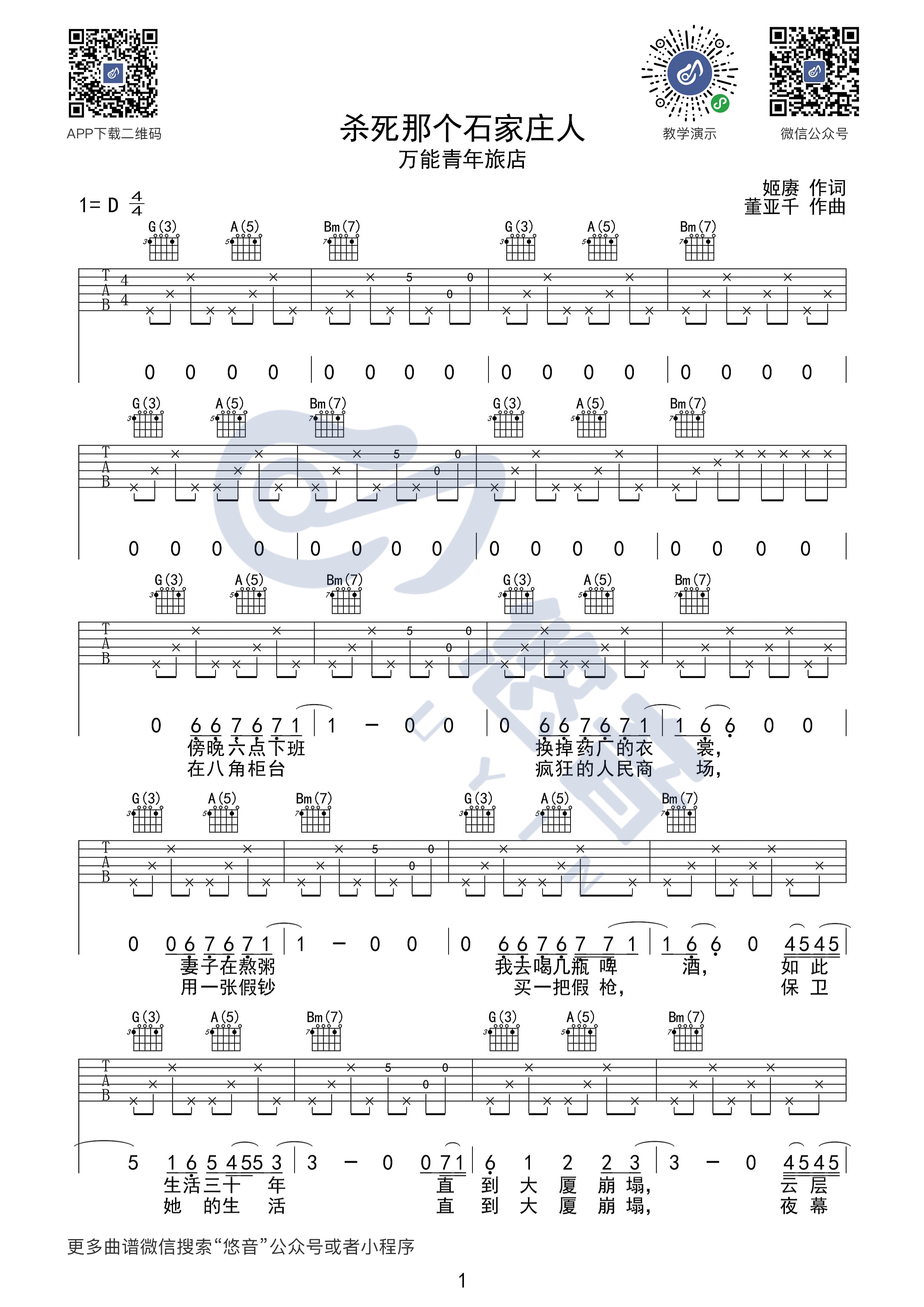 曲谱介绍: 万能青年旅店《杀死那个石家庄人》吉他弹唱谱,采用D调指法编配,共有3张高清图谱。
