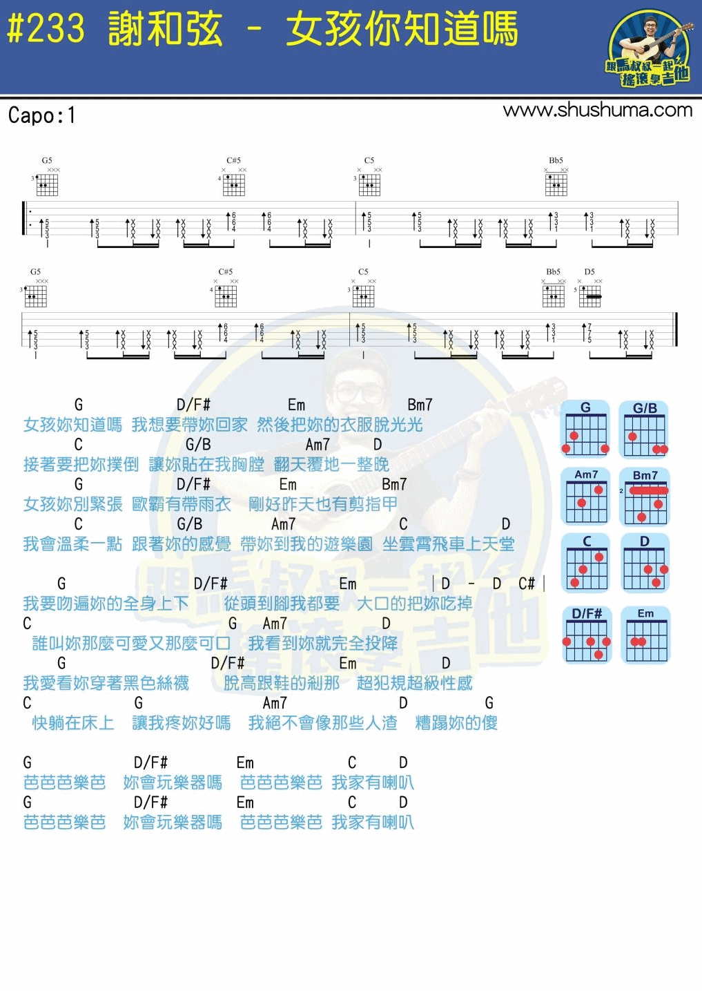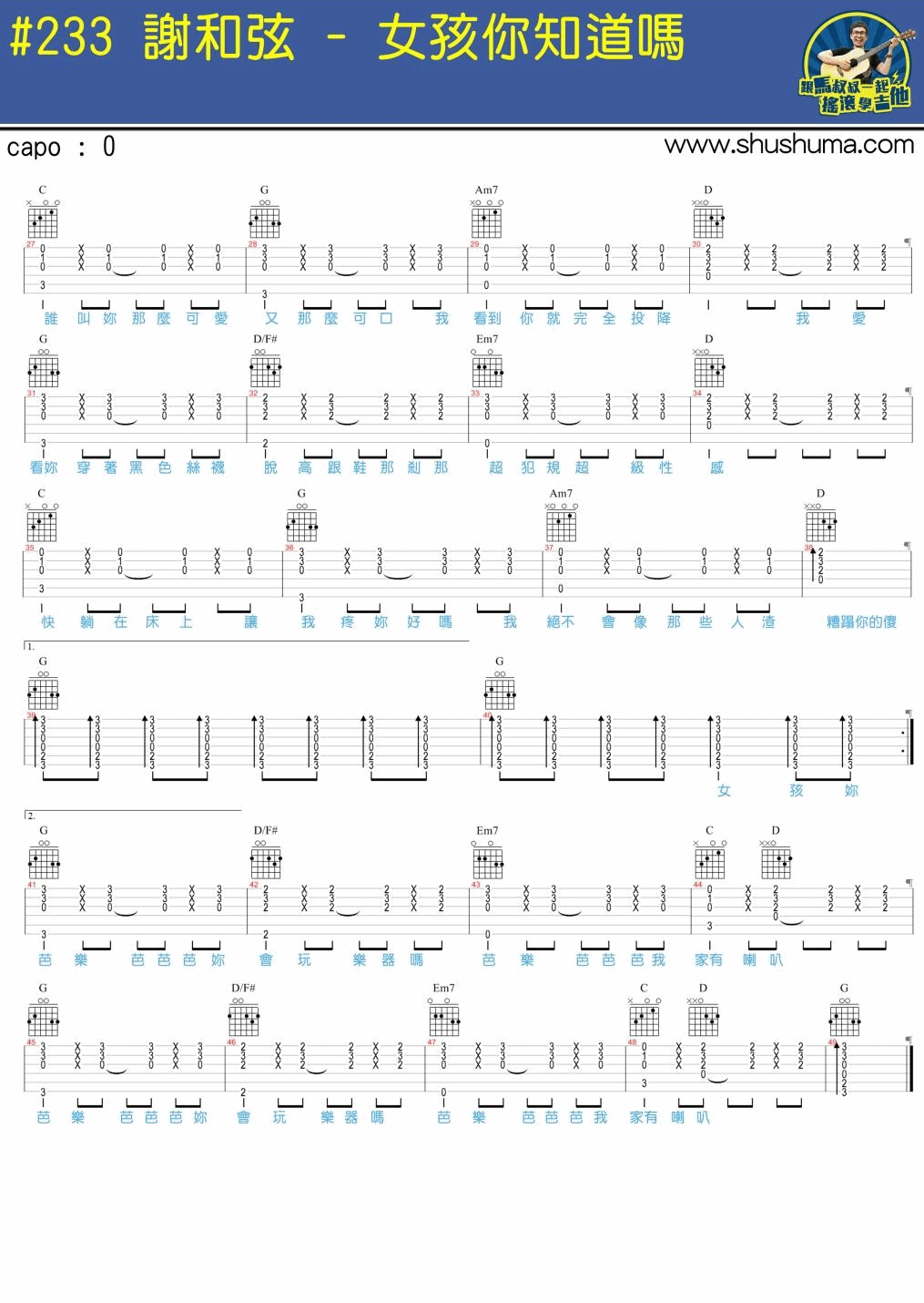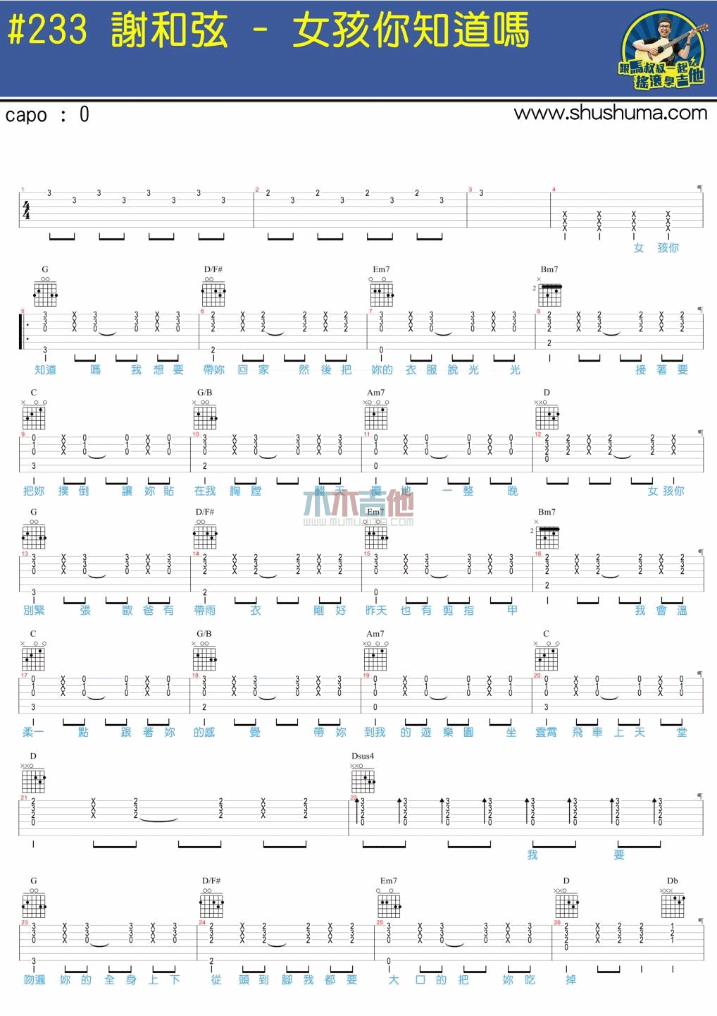曲谱介绍: 谢和弦《女孩你知道吗》吉他弹唱谱,采用C调指法编配,马叔叔编配出品,共有3张高清图谱。