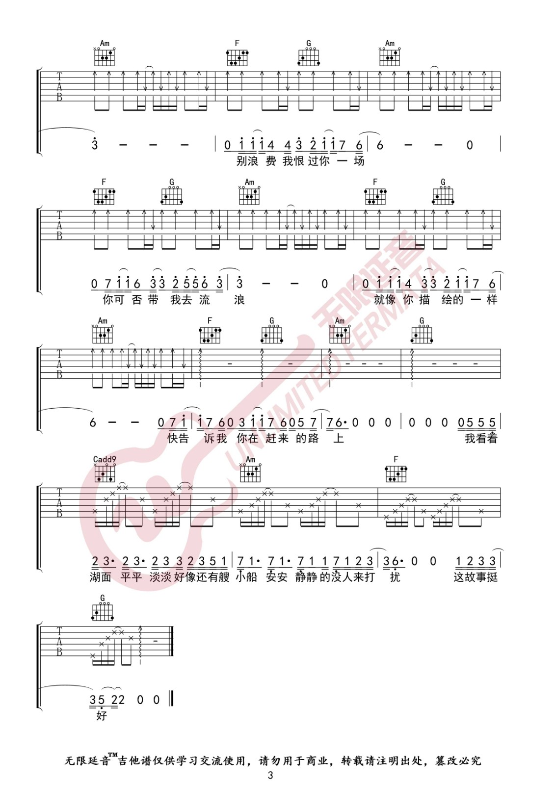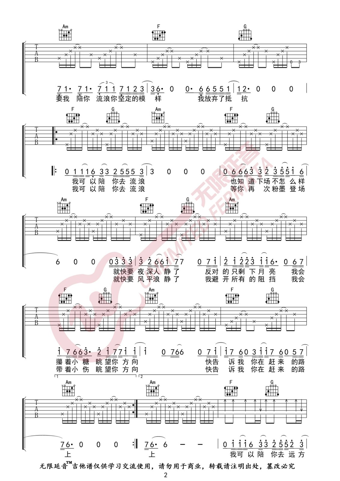 曲谱介绍: 薛之谦《陪你去流浪》吉他弹唱谱,采用C调指法编配,无限延音编配出品,共有3张高清图谱。