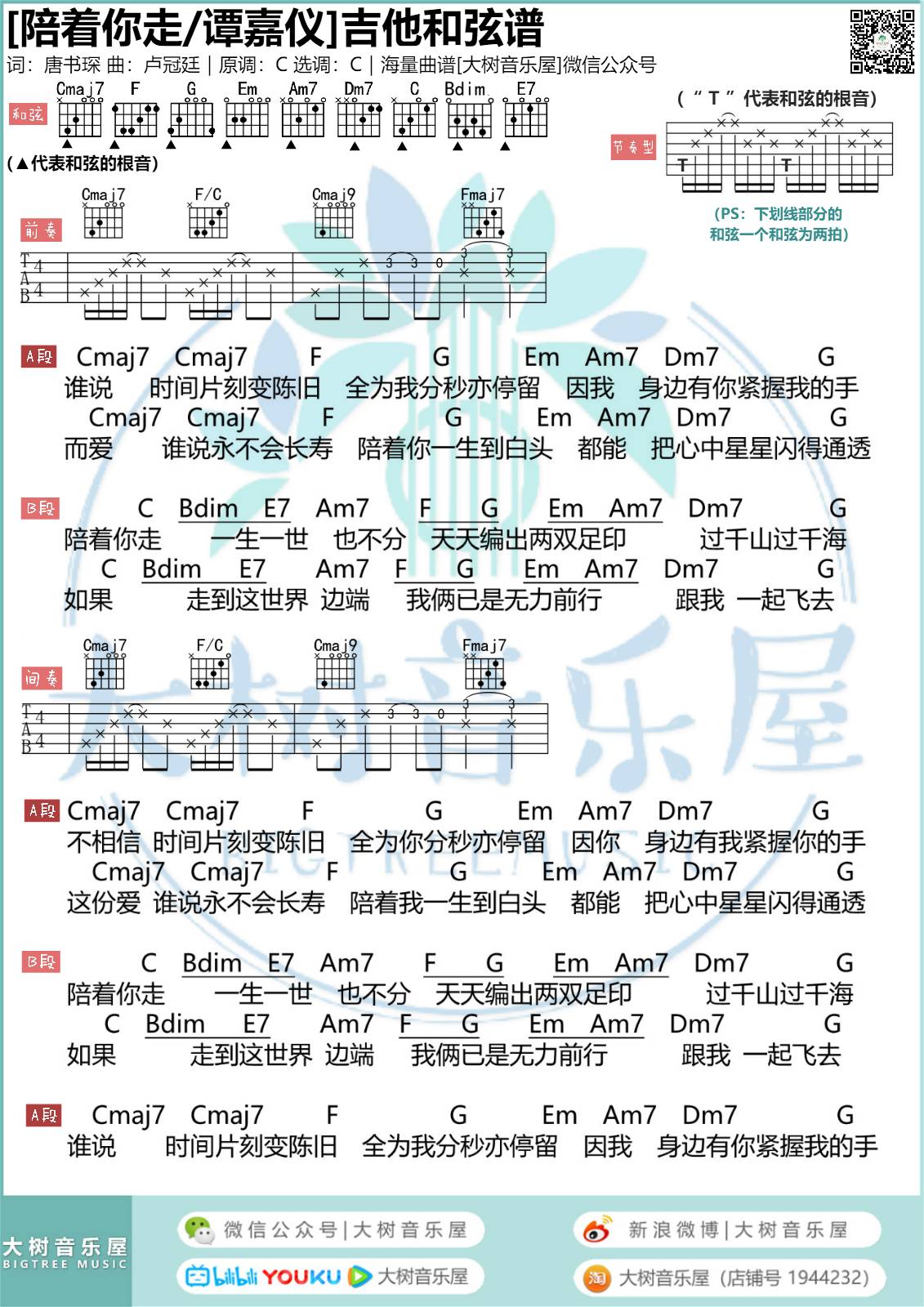 曲谱介绍: 谭嘉仪《陪着你走》吉他弹唱谱,采用C调指法编配,大树音乐屋编配出品,共有1张高清图谱,免翻页排版设计。
