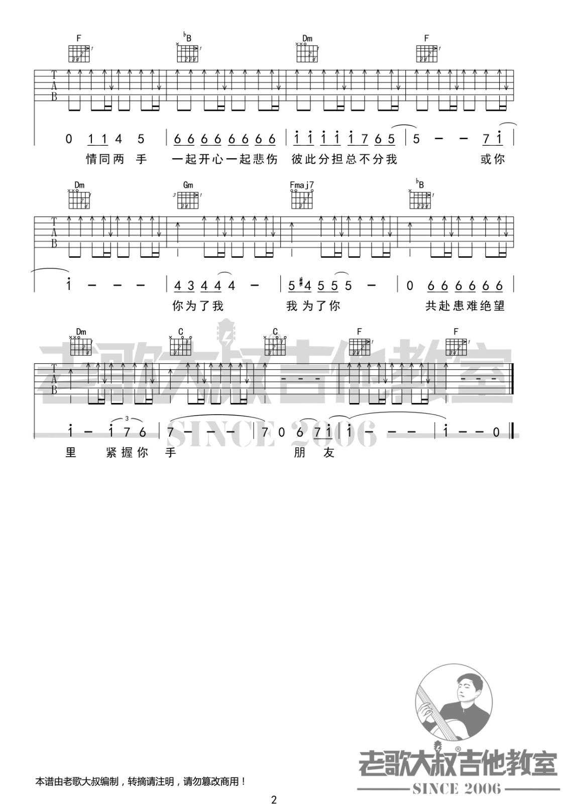 曲谱介绍: 谭咏麟《朋友》吉他弹唱谱,采用F调指法编配,老歌大叔吉他教室编配出品,共有2张高清图谱,免翻页排版设计。