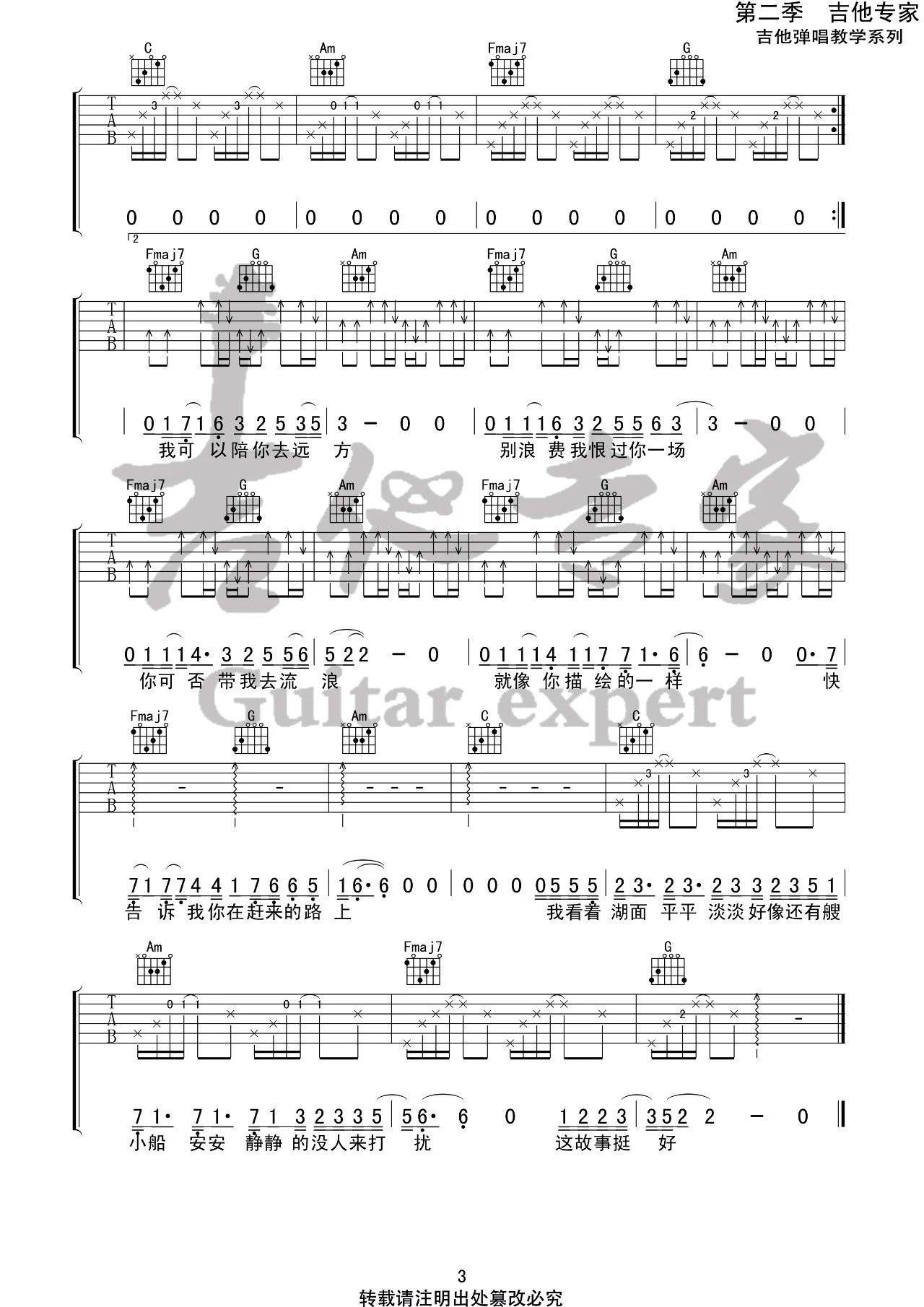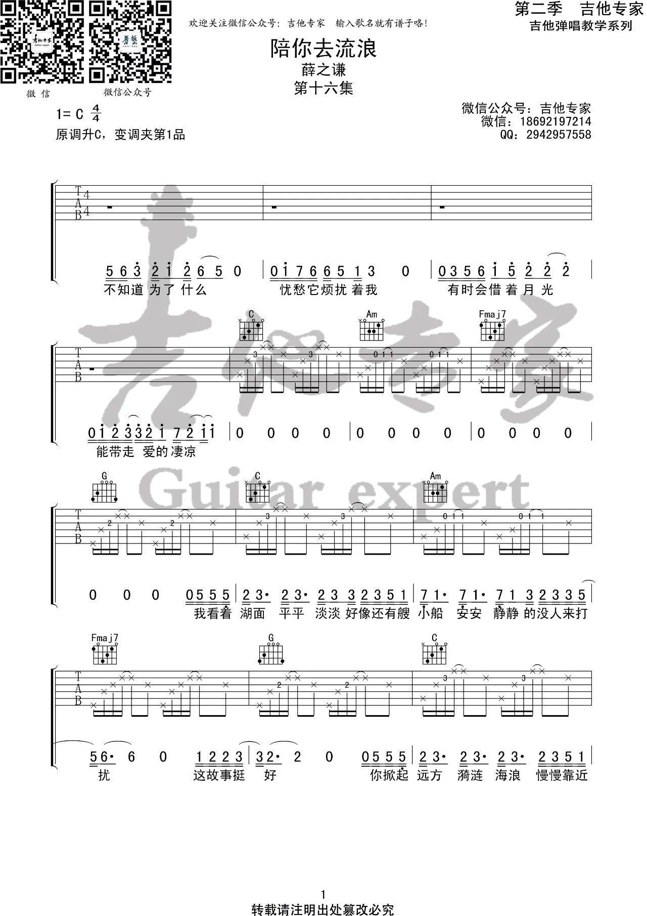 曲谱介绍: 薛之谦《陪你去流浪》吉他弹唱谱,采用C调指法编配,音艺吉他编配出品,共有3张高清图谱。