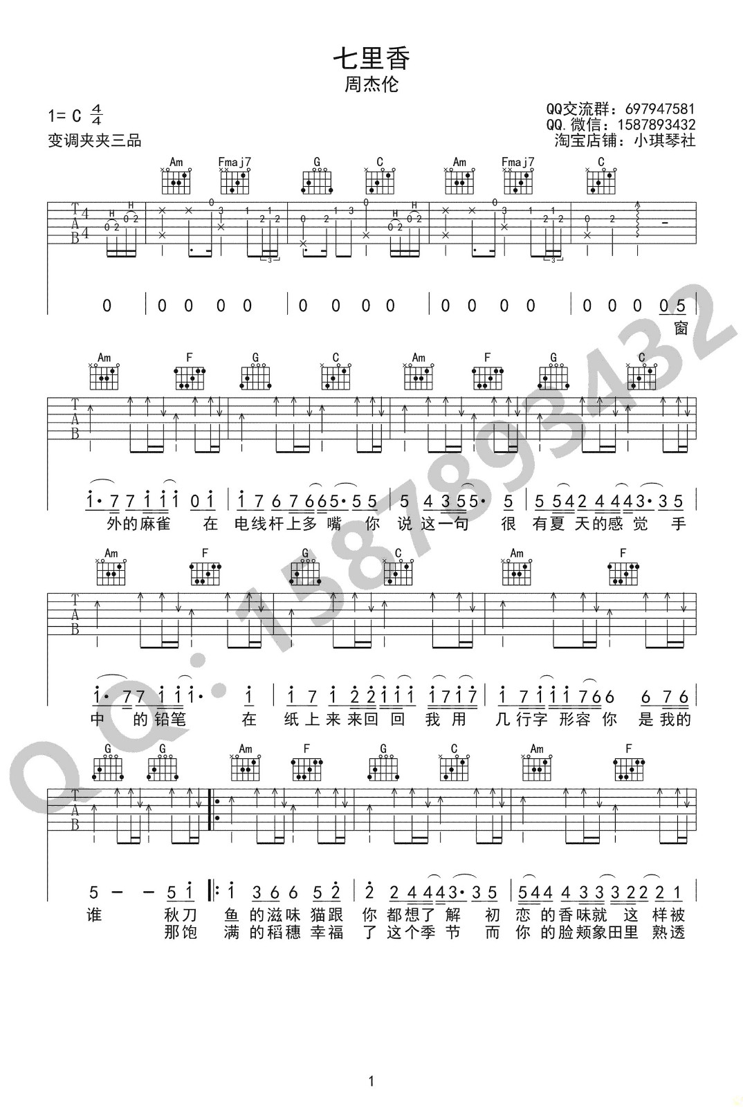 曲谱介绍: 周杰伦《七里香》吉他弹唱谱,采用C调指法编配,巍小琪编配出品,共有2张高清图谱,免翻页排版设计。